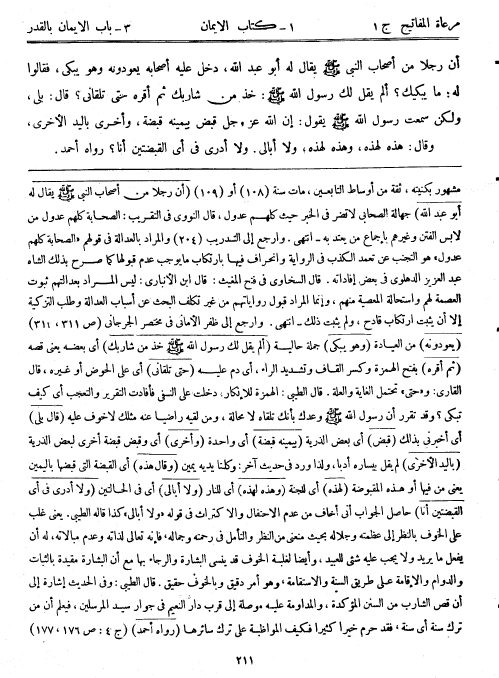 مشهور بكنيته، ثقة من أوساط التابعين، مات سنة (108) أو (109) . (أن رجلا من أصحاب النبي - صلى الله عليه وسلم - يقال له أبوعبد الله) جهالة الصحابي لا تضر في الخبر حيث كلهم عدول، قال النووي في التقريب: الصحابة كلهم عدول من لابس الفتن وغيرهم بإجماع من يعتد به –انتهى. وارجع إلى التدريب (204) والمراد بالعدالة في قولهم "الصحابة كلهم عدول" هو التجنب عن تعمد الكذب في الرواية وانحراف فيها بارتكاب ما يوجب عدم قبولها، كما صرح بذلك الشاه عبد العزيز الدهلوي في بعض إفادته. قال السخاوي في فتح المغيث: قال ابن الأنباري: ليس المراد بعدالتهم ثبوت العصمة لهم واستحالة المعصية منهم، وإنما المراد قبول رواياتهم من غير تكلف البحث عن أسباب العدالة وطلب التزكية إلا أن يثبت ارتكاب قادح، ولم يثبت ذلك 0انتهى. وارجع إلى ظفر الأماني في مختصر الجرجاني (ص312، 311) (يعودونه) من العبادة (وهو يبكي) جملة حالية (ألم يقل لك رسول الله - صلى الله عليه وسلم - خذ من شاربك) أي بعضه يعني قصه (ثم أقره) بفتح الهمزة وكسر القاف وتشديد الراء، أي دم عليه (حتى تلقاني) أي على الحوض أو غيره، قال القاري: و "حتى" تحتمل الغاية والعلة. قال الطيبي: الهمزة للإنكار، دخلت على النفي فأفادت التقرير والتعجب أي كيف تبكي؟ وقد تقرر أن رسول الله - صلى الله عليه وسلم - وعدك بأنك تلقاه لا محالة، ومن لقيه راضياً عنه مثلك لا خوف عليه قال: بلى) أي أخبرني بذلك (قبض) أي بعض الذرية (بيمينه قبضة) أي واحدة (وأخرى) أي وقبض قبضة أخرى لبعض الذرية (باليد الأخرى) لم يقل بيساره أدباً، ولذا ورد في حديث آخر: وكلتا يديه يمين (وقال هذه) أي القبضة التي قبضها باليمين يعني من فيها أو هذه المقبوضة. (لهذه) أي للجنة (وهذه لهذه) أي للنار (ولا أبالي) أي في الحالتين (ولا أدري في أي القبضتين أنا) حاصل الجواب أني أخاف من عدم الاحتفال والاكتراث في قوله: "ولا أبالي"، كذا قاله الطيبي. يعني غلب علي الخوف بالنظر إلى عظمته وجلاله بحيث منعني من النظر والتأمل في رحمته وجماله، فإنه تعالى لذاته وعدم مبالاته، له أن يفعل ما يريد، ولا يجب عليه شيء للعبيد، وأيضاً لغلبة الخوف قد ينسى البشارة والرجاء بها مع أن البشارة مقيدة بالثبات والدوام والإقامة على طريق السنة والاستقامة، وهو أمر دقيق وبالخوف حقيق. قال الطيبي: وفي الحديث إشارة إلى أن قص الشارب من السنن المؤكدة، والمداومة عليه موصلة إلى قرب دار النعيم في جوار سيد المرسلين، فيعلم أن من ترك سنة أي سنة، فقد حرم خيراً كثيراً فكيف المواظبة على ترك سائرها. (رواه أحمد) (ج4:ص176، 177)