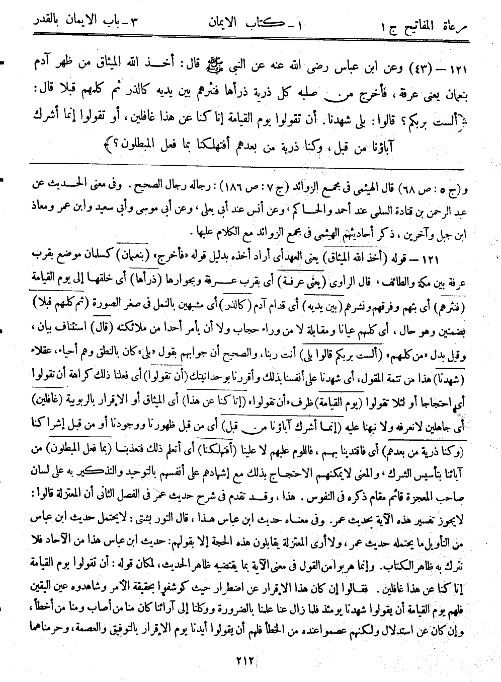 121- قوله: (أخذ الله الميثاق) يعني العهد أي أراد أخذه بدليل قوله: "فأخرج"، (بنعمان) كسلمان موضع بقرب عرفة بين مكة والطائف، قال الراوي (يعني عرفة) أي بقرب عرفة وبجوارها. (ذرأها) أي خلقها إلى يوم القيامة (فنثرهم) أي بثهم وفرقهم ونشرهم (بين يديه) أي قدام آدم (كالذر) أي مشبهين بالنمل في صغر الصورة. (ثم كلمهم قبلاً) بضمتين وهو حال، أي كلمهم عيانا ومقابلة لا من وراء حجاب ولا أن يأمر أحداً من ملائكته (قال) استئناف بيان، وقيل بدل "من كلمهم". (ألست بربكم قالوا بلى) أنت ربنا، والصحيح أن جوابهم بقول "بلى" كان بالنطق وهم أحياء، عقلاء. (شهدنا) هذا من تتمة المقول، أي شهدنا على أنفسنا بذلك وأقررنا بوحدانيتك. (أن تقولوا) أي فعلنا ذلك كراهة أن تقولوا أي احتجاجا أو لئلا تقولوا (يوم القيامة) ظرف "أن تقولوا" (إنا كنا عن هذا) أي الميثاق أو الإقرار بالربوبية (غافلين) أي جاهلين لا نعرفه ولا نبهنا عليه. (إنما أشرك آباؤنا من قبل) أي من قبل ظهورنا ووجودنا أو من قبل إشراكنا (وكنا ذرية من بعدهم) أي فاقتدينا بهم، فاللوم عليهم لا علينا (أفتهلكنا) أي أتعلم ذلك فتعذبنا (بما فعل المبطلون) من آبائنا بتأسيس الشرك، والمعنى لا يمكنهم الاحتجاج بذلك مع إشهادهم على أنفسهم بالتوحيد والتذكير به على لسان صاحب المعجزة قائم مقام ذكره في النفوس. هذا، وقد تقدم في شرح حديث عمر في الفصل الثاني أن المعتزلة قالوا: لا يجوز تفسير هذه الآية بحديث عمر. وفي معناه حديث ابن عباس هذا، قال التوربشتي: لايحتمل حديث ابن عباس من التأويل ما يحتمله حديث عمر، ولا أرى المعتزلة يقابلون هذه الحجة إلا بقولهم: حديث ابن عباس هذا من الآحاد فلا نترك به ظاهر الكتاب. وإنما هربوا من القول في معنى الآية بما يقتضيه ظاهر الحديث، لمكان قوله: أن تقولوا يوم القيامة إنا كنا عن هذا غافلين. فقالوا إن كان هذا الإقرار عن اضطرار حيث كوشفوا بحقيقة الأمر وشاهدوه عين اليقين فلهم يوم القيامة أن يقولوا شهدنا يومئذٍ فلما زال عنا علمنا بالضرورة ووكلنا إلى آرائنا كان منا من أصاب ومنا من أخطأ، وإن كان عن استدلال ولكنهم عصموا عنده من الخطأ فلهم أن يقولوا أيدنا يوم الإقرار بالتوفيق والعصمة، وحرمناهما