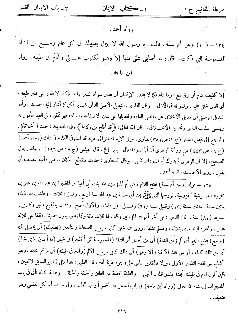 124- (4) وعن أم سلمة، قالت: ((يارسول الله لا يزال يصيبك في كل عام وجع من الشاة المسمومة التي أكلت. قال: ما أصابني شيء منها إلا وهو مكتوب علي وآدم في طينته)) ، رواه ابن ماجة.