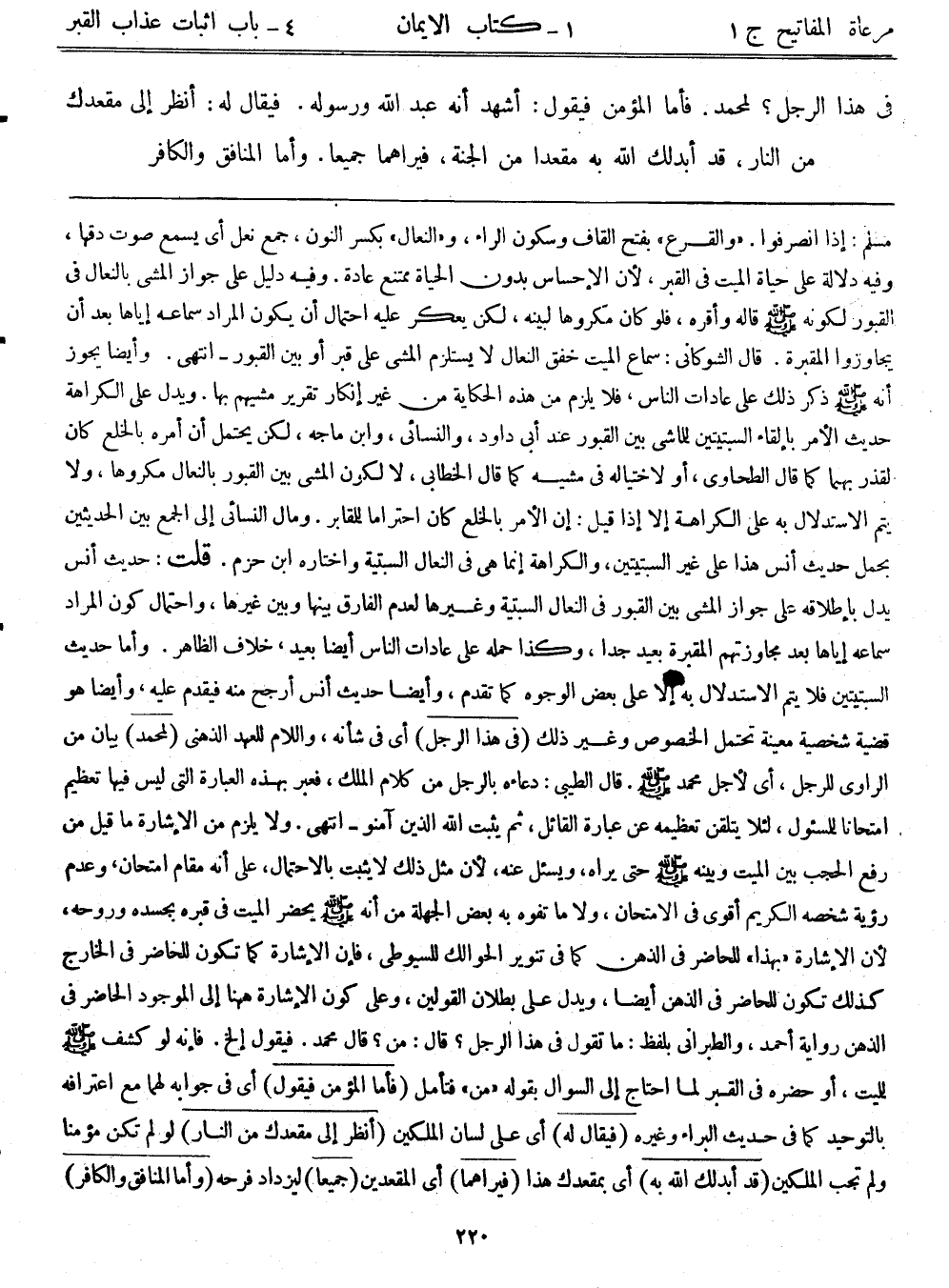 مسلم: (إذا انصرفوا) . "والقرع" بفتح القاف وسكون الراء، و"النعال" بكسر النون، جمع نعل أي يسمع صوت دقها، وفيه دلالة على حياة الميت في القبر؛ لأن الإحساس بدون الحياة ممتنع عادة. وفيه دليل على جواز المشي بالنعال في القبور لكونه - صلى الله عليه وسلم - قاله وأقره، فلو كان ًمكروهاً لبينه، لكن يعكر عليه احتمال أن يكون المراد سماعه إياها بعد أن يجاوزوا المقبرة. قال الشوكاني: سماع الميت خفق النعال لا يستلزم المشي على قبر أو بين القبور –انتهى. وأيضاً يجوز أنه - صلى الله عليه وسلم - ذكر ذلك على عادات الناس، فلا يلزم من هذه الحكاية من غير إنكار تقرير مشيهم بها. ويدل على الكراهة حديث الأمر بإلقاء السبتيتين للماشي بين القبور عند أبي داود والنسائي وابن ماجة، لكن يحتمل أن أمره بالخلع كان لقذر بهما كما قال الطحاوي، أو لاختياله في مشيه كما قال الخطابي، لا لكون المشي بين القبور بالنعال مكروهاً، ولا يتم الاستدلال به على الكراهة إلا إذا قيل: إن الأمر بالخلق كان احتراماً للمقابر. ومال النسائي إلى الجمع بين الحديثين بحمل حديث أنس هذا على غير السبتيتين، والكراهة إنما هي في النعال السبتية واختاره ابن حزم. قلت: حديث أنس يدل بإطلاقه على جواز المشي بين القبور في النعال السبتيتين وغيرها لعدم الفارق بينها وبين غيرها، واحتمال كون المراد سماعه إياها بعد مجاوزتهم المقبرة بعد جداً، وكذا حمله على عادات الناس أيضاً بعيد خلاف الظاهر، وأما حديث السبتيتين فلا يتم الاستدلال به إلا على بعض الوجوه كما تقدم، وأيضاً حديث أنس أرجح منه فيقدم عليه، وأيضاً هو قضية شخصية معينة تحتمل الخصوص وغير ذلك. (في هذا الرجل) أي في شأنه، واللام للعهد الذهني (لمحمد) بيان من الراوي للرجل، أي لأجل محمد - صلى الله عليه وسلم -. قال الطيبي: دعاؤه بالرجل من كلام الملك، فعبر بهذه العبارة التي ليس فيها تعظيم امتحاناً للمسئول، لئلا يتلقن تعظيمه عن عبارة القائل، ثم يثبت الله الذين آمنوا – انتهى. ولا يلزم من الإشارة ما قيل من رفع الحجب بين الميت وبينه - صلى الله عليه وسلم - حتى يراه، ويسئل عنه؛ لأن مثل ذلك لا يثبت بالاحتمال، على أنه مقام امتحان، وعدم رؤية شخصه الكريم أقوى في الامتحان، ولا ما تفوه به بعض الجهلة من أنه - صلى الله عليه وسلم - يحضر الميت في قبره بجسده وروحه؛ لأن الإشارة بهذا للحاضر في الذهن كما في تنوير الحوالك للسيوطي، فإن الإشارة كما تكون للحاضر في الخارج كذلك تكون للحاضر في الذهن أيضاً، ويدل على بطلان القولين، وعلى كون الإشارة ههنا إلى الموجود الحاضر في الذهن رواية أحمد، والطبراني بلفظ: ((ما تقول في هذا الرجل؟ قال: من؟ قال محمد. فيقول ... )) الخ. فإنه لو كشف - صلى الله عليه وسلم - للميت، أو حضره في القبر لما احتاج إلى السؤال بقوله: "من" فتأمل (فأما المؤمن فيقول) أي في جوابه لهما مع اعترافه بالتوحيد كما في حديث البراء وغيره (فيقال له) أي على لسان الملكين (انظر إلى مقعدك من النار) لو لم تكن مؤمناً ولم تجب الملكين (قد أبدلك الله به) أي بمقعدك هذا (فيراهما) أي المقعدين (جميعاً) ليزداد فرحه (وأما المنافق والكافر)