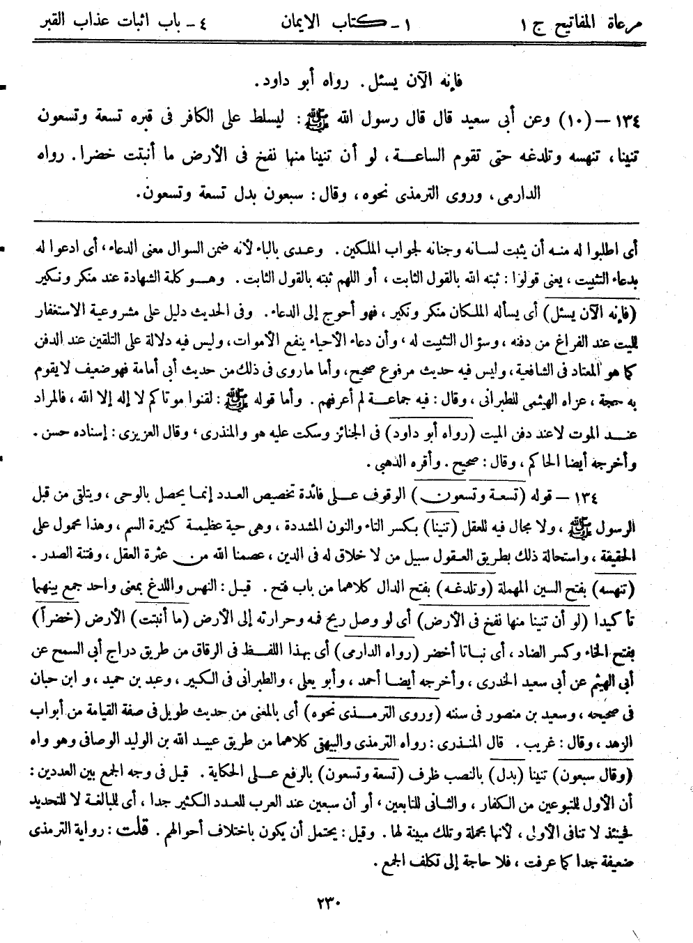 134- قوله: (تسعة وتسعون) الوقوف على فائدة تخصيص العدد إنما يحصل بالوحي، ويتلقى من قبل الرسول - صلى الله عليه وسلم -، ولا مجال فيه للعقل (تنيناً) بكسر التاء والنون المشددة، وهي حية عظيمة كثيرة السم، وهذا محمول على الحقيقة، واستحالة ذلك بطريق العقول سبيل من لا خلاق له في الدين، عصمنا الله من عثرة العقل، وفتنة الصدر. (تنهسه) بفتح السين المهملة (وتلدغه) بفتح الدال كلاهما من باب فتح. قيل: النهس واللدغ بمعنى واحد جمع بينهما تأكيداً (لو أن تنيناً منها نفخ في الأرض) أي لو وصل ريح فمه وحرارته إلى الأرض (ما أنبتت) الأرض (خضراً) بفتح الخاء وكسر الضاد، أي نباتاً أخضر (رواه الدارمي) أي بهذا اللفظ في الرقاق من طريق دراج أبي السمح عن أبي الهيثم عن أبي سعيد الخدري، وأخرجه أيضاً أحمد، وأبويعلى، والطبراني في الكبير، وعبد بن حميد، وابن حبان في صحيحه، وسعيد بن منصور في سننه. (وروى الترمذي نحوه) أي بالمعنى من حديث طويل في صفة القيامة من أبواب الزهد، وقال: غريب. قال المنذري: رواه الترمذي والبيهقي كلاهما من طريق عبيد الله بن الوليد الوصافي وهو واهٍ. (وقال سبعون) تنيناً (بدل) بالنصب ظرف (تسعة وتسعون) بالرفع على الحكاية. قيل في وجه الجمع بين العددين: أن الأول للمتبوعين من الكفار، والثاني للتابعين، أو أن سبعين عند العرب للعدد الكثير جداً، أي للمبالغة لا للتحديد فحينئذٍ لا تنافي الأولى؛ لأنها مجملة وتلك مبينة لها. وقيل: يحتمل أن يكون باختلاف أحوالهم. قلت: رواية الترمذي ضعيفة جداً كما عرفت، فلا حاجة إلى تكلف الجمع.