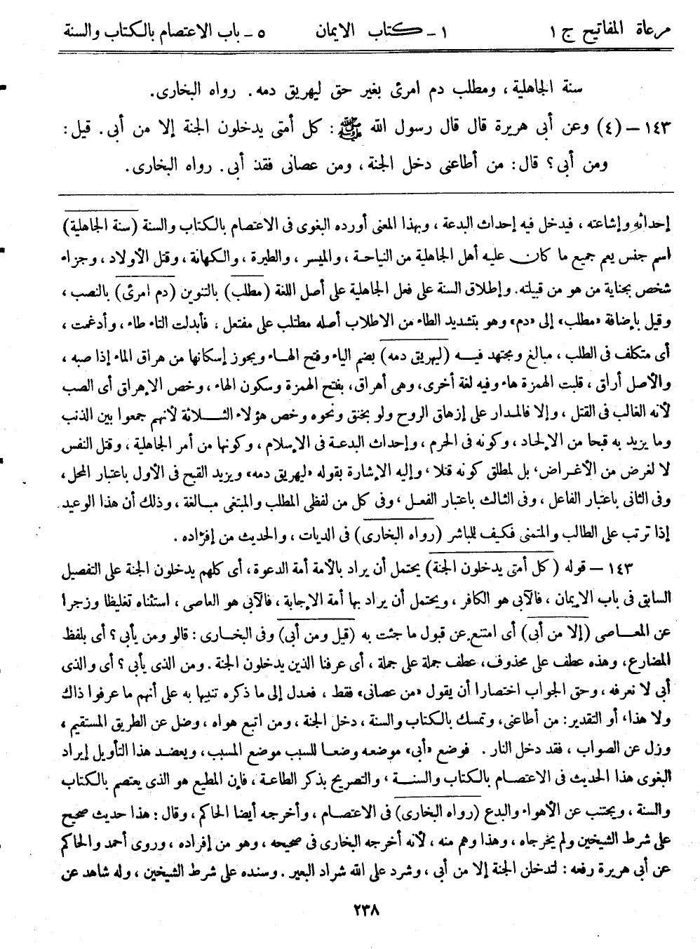 143- قوله: (كل أمتي يدخلون الجنة) يحتمل أن يراد بالأمة أمة الدعوة، أي كلهم يدخلون الجنة على التفصيل السابق في باب الإيمان، فالآبى هو الكافر، ويحتمل أن يراد بها أمة الإجابة، فالآبى هو العاصي، استثناه تغليظاً وزجراً عن المعاصي. (إلا من أبى) أي امتنع عن قبول ما جئت به (قيل: ومن أبى) وفي البخاري: قالوا: ومن يأبى؟ أي بلفظ المضارع، وهذه عطف على محذوف، عطف جملة على جملة، أي عرفنا الذين يدخلون الجنة. ومن الذى يأبى؟ أي والذى أبى لا نعرفه، وحق الجواب اختصاراً أن يقول "من عصاني" فقط، فعدل إلى ما ذكره تنبيهاً به على أنهم ما عرفوا ذاك ولا هذا، أو التقدير: من أطاعنى، وتمسك بالكتاب والسنة، دخل الجنة، ومن اتبع هواه، وضل عن الطريق المستقيم، وزل عن الصواب، فقد دخل النار. فوضع "أبى" موضعه وضعا للسبب موضع المسبب، ويعضد هذا التاويل إيراد البغوي هذا الحديث في الاعتصام بالكتاب والسنة، والتصريح بذكر الطاعة، فإن المطيع هو الذى يعتصم بالكتاب والسنة، ويجتنب عن الأهواء والبدع. (رواه البخاري) في الاعتصام، وأخرجه أيضاً الحاكم، وقال: هذا حديث صحيح على شرط الشيخين ولم يخرجاه، وهذا وهم منه؛ لأنه أخرجه البخاري في صحيحه، وهو من إفراده، وروى أحمد والحاكم عن أبي هريرة رفعه: لتدخلن الجنة إلا من أبى، وشرد على الله شراد البعير. وسنده على شرط الشيخين، وله شاهد عن