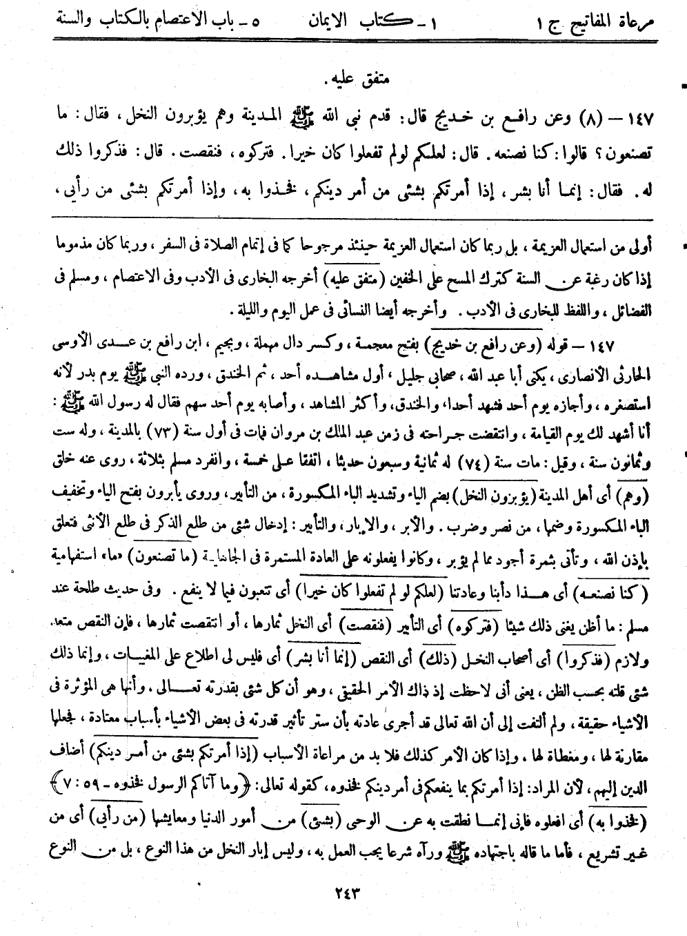 147- قوله: (وعن رافع بن خديج) بفتح معجمة، وكسر دال مهملة، وبجيم، ابن رافع بن عدى الأوسي الحارثي الأنصاري، يكنى أباعبد الله، صحابي جليل، أول مشاهده أحد، ثم الخندق، ورده النبي - صلى الله عليه وسلم - يوم بدر؛ لأنه استصغره، وأجازه يوم أحد فشهد أحداً، والخندق، وأكثر المشاهد، وأصابه يوم أحد سهم فقال له رسول الله - صلى الله عليه وسلم -: أنا أشهد لك يوم القيامة، وانتقضت جراحته في زمن عبد الملك بن مروان فمات في أول سنة (73) بالمدينة، وله ست وثمانون سنة، وقيل: مات سنة (74) له ثمانية وسبعون حديثاً، اتفقا على خمسة، وانفرد مسلم بثلاثة، روى عنه خلق. (وهم) أي أهل المدينة (يؤبرون النخل) بضم الياء وتشديد الباء المكسورة، من التأبير، وروى يأبرون بفتح الياء وتخفيف الباء المكسورة وضمها، من نصر وضرب. والأبر، والإبار، والتأبير: إدخال شيء من طلع الذكر في طلع الأنثى فتعلق بإذن الله، وتأتي بثمرة أجود مما لم يؤبر، وكانوا يفعلونه على العادة المستمرة في الجاهلية. (ما تصنعون) "ما" استفهامية (كنا نصنعه) أي هذا دأبنا وعادتنا. (لعلكم لو لم تفعلوا كان خيراً) أي تتعبون فيما لا ينفع. وفي حديث طلحة عند مسلم: ما أظن يغنى ذلك شيئاً (فتركوه) أي التأبير (فنقصت) أي النخل ثمارها، أو انتقصت ثمارها، فإن النقص متعد ولازم (فذكروا) أي أصحاب النخل (ذلك) أي النقص (إنما أنا بشر) أي فليس لي اطلاع على المغيبات، وإنما ذلك شيء قلته بحسب الظن، يعني أني لاحظت إذ ذلك الأمر الحقيقي، وهو أن كل شيء بقدرته تعالى، وأنها هي المؤثرة في الأشياء حقيقة، ولم ألتفت إلى أن الله تعالى قد أجرى عادته بأن ستر تأثير قدرته في بعض الأشياء بأسباب معتادة، فجعلها مقارنة لها ومغطاة لها، وإذا كان الأمر كذلك فلا بد من مراعاة الأسباب. (إذا أمرتكم بشيء من أمر دينكم) أضاف الدين إليهم؛ لأن المراد: إذا أمرتكم بما ينفعكم في أمر دينكم فخذوه، كقوله تعالى:: {وما آتاكم الرسول فخذوه} [7:59] (فخذوا به) أي افعلوه فإني إنما نطقت به عن الوحي. (بشيء) من أمور الدنيا ومعايشها (من رأي) أي من غير تشريع، فأما ما قاله باجتهاد - صلى الله عليه وسلم - ورآه شرعاً يجب العمل به، وليس إبار النخل من هذا النوع، بل من النوع