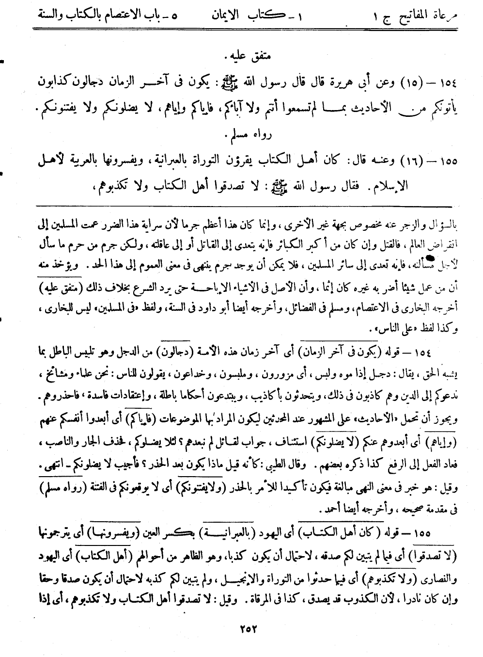 155- قوله: (كان أهل الكتاب) أي اليهود (بالعبرانية) بكسر العين (ويفسرونها) أي يترجمونها (لا تصدقوا) أي فيما لم يتبين لكم صدقة، لاحتمال أن يكون كذباً، وهو الظاهر من أحوالهم (أهل الكتاب) أي اليهود والنصارى (ولا تكذبوهم) أي فيما حدثوا من التوراة والإنجيل، ولم يتبين لكم كذبه لاحتمال أن يكون صدقاً وحقاً وإن كان نادرا؛ لأن الكذوب قد يصدق، كذا في المرقاة. وقيل: لا تصدقوا أهل الكتاب ولا تكذبوهم، أي إذا