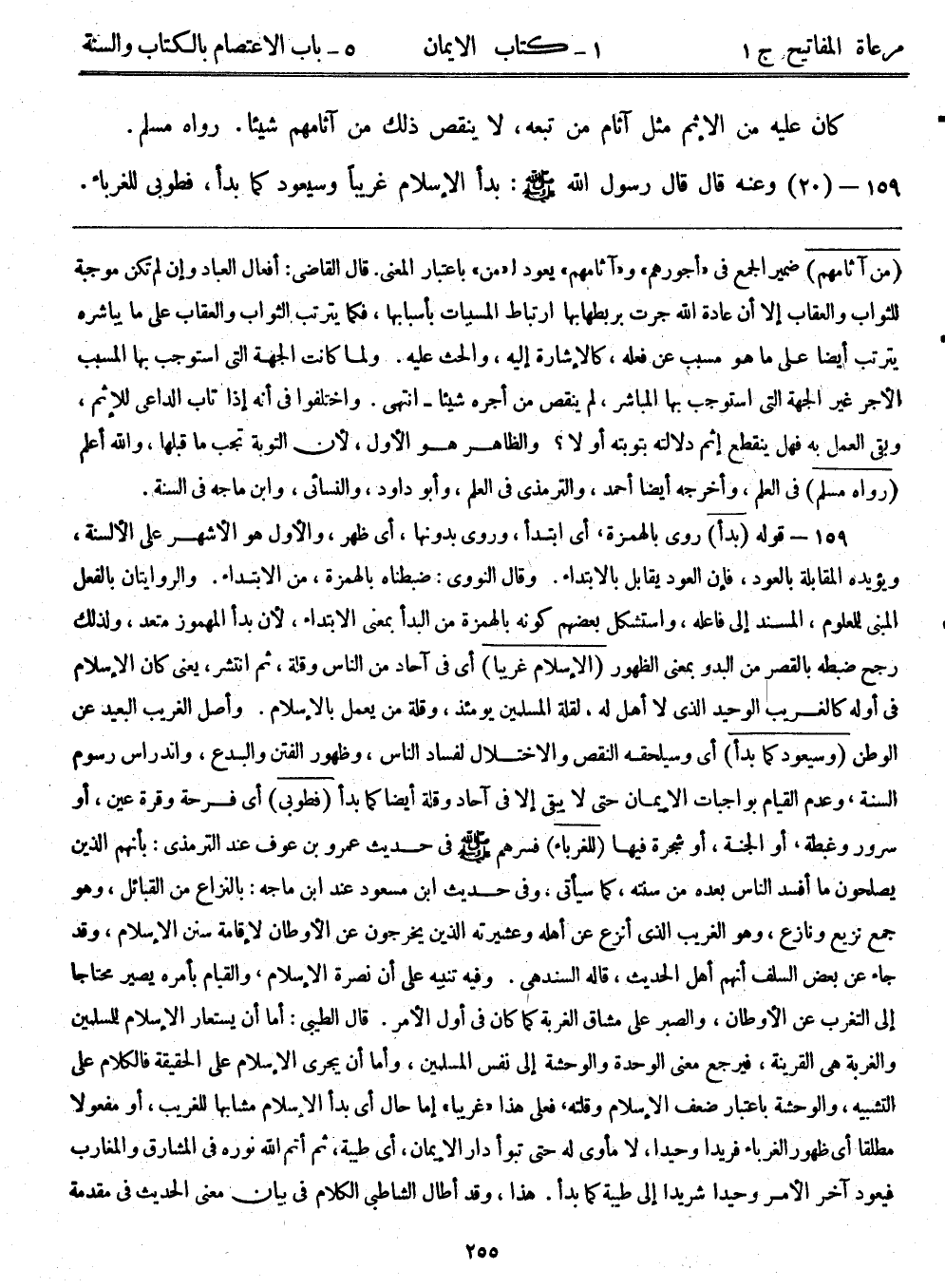 159- قوله: (بدأ) روي بالهمزة، أي ابتدأ، وروى بدونها، أي ظهر، والأول هو الأشهر على الألسنة، ويؤيده المقابلة بالعود، فإن العود يقابل بالابتداء. وقال النووى: ضبطناه بالهمزة، ومن الابتداء. والروايتان بالفعل المبني للمعلوم، المسند إلى فاعله، واستشكل بعضهم كونه بالهمزة من البدأ بمعنى الابتداء؛ لأن بدأ المهموز متعد، ولذلك رجح ضبطه بالقصر من البدو بمعنى الظهور (الإسلام غريبا) أي في آحاد من الناس وقلة ثم انتشر، يعني كان الإسلام في أوله كالغريب الوحيد الذي لا أهل له؛ لقلة المسلمين يومئذٍ، وقلة من يعمل بالإسلام. وأصل الغريب البعيد عن الوطن (وسيعود كما بدأ) أي وسيلحقه النقص والاختلال لفساد الناس، وظهور الفتن والبدع، واندراس رسوم السنة، وعدم القيام بواجبات الإيمان حتى لا يبقى إلا في آحاد وقلة أيضاً كما بدأ (فطوبى) أي فرحة وقرة عين، أو سرور وغبطة، أو الجنة، أو شجرة فيها (للغرباء) فسرهم - صلى الله عليه وسلم - في حديث عمرو بن عوف عند الترمذي: بأنهم الذين يصلحون ما أفسد الناس بعده من سنته، كما سيأتي، وفي حديث ابن مسعود عند ابن ماجه: بالنزاع من القبائل، وهو جمع نزيع ونازع، وهو الغريب الذي أنزع عن أهله وعشيرته الذين يخرجون عن الأوطان لإقامة سنن الإسلام، وقد جاء عن بعض السلف أنهم أهل الحديث، قاله السندهي. وفيه تنبيه على أن نصرة الإسلام، والقيام بأمره يصير محتاجاً إلى التغرب عن الأوطان، والصبر على مشاق الغربة كما كان في أول الأمر. قال الطيبي: أما أن يستعار الإسلام للمسلمين والغربة هي القرينة، فيرجع معنى الوحدة والوحشة إلى نفس المسلمين، وأما أن يجرى الإسلام على الحقيقة فالكلام على التشبيه، والوحشة باعتبار ضعف الإسلام وقلته، فعلى هذا "غريباً" إما حال أي بدأ الإسلام مشابهاً للغريب، أو مفعولاً مطلقاً أي ظهور الغرباء فريداً وحيداً، لا مأوى له حتى تبوأ دار الإيمان، أي طيبة، ثم أتم الله نوره في المشارق والمغارب فيعود آخر الأمر وحيداً شريداً إلى طيبة كما بدأ. هذا، وقد أطال الشاطبي الكلام في بيان معنى الحديث في مقدمة