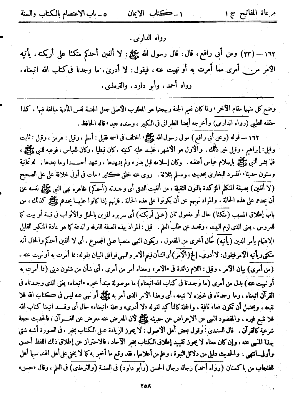 162- (23) وعن أبي رافع، قال: قال رسول الله - صلى الله عليه وسلم -: ((لا ألفين أحدكم متكئاً على أريكته، يأتيه الأمر من أمري مما أمرت به أو نهيت عنه، فيقول: لا أدرى، ما وجدنا في كتاب الله اتبعناه)) رواه أحمد، وأبوداود، والترمذي،