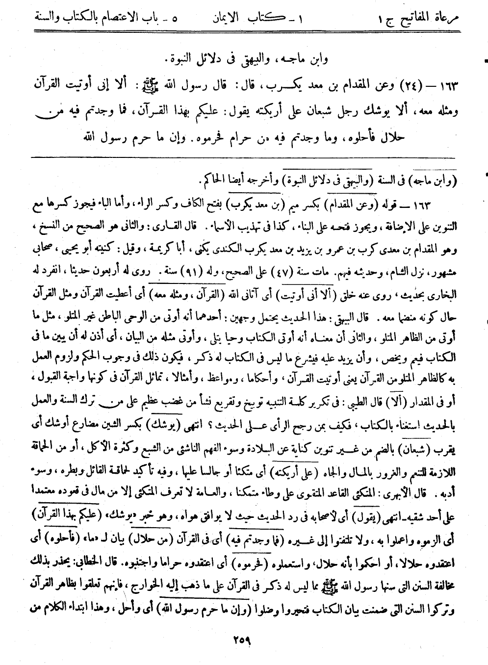 163- قوله: (وعن المقدام) بكسر ميم (بن معد يكرب) بفتح الكاف وكسر الراء، وأما الباء فيجوز كسرها مع التنوين على الإضافة، ويجوز فتحه على البناء، كذا في تهذيب الأسماء. قال القاري: والثاني هو الصحيح من النسخ، وهو المقدام بن معديكرب بن عمرو بن يزيد بن معديكرب الكندي يكنى أباكريمة، وقيل: كنيته أبويحيى، صحابي مشهور، نزل الشام، وحديثه فيهم. مات سنة (47) على الصحيح، وله (91) سنة. روي له أربعون حديثاً، انفرد له البخاري بحديث، روى عنه خلق (ألا أني أوتيت) أي آتاني الله (القرآن، ومثله معه) أي أعطيت القرآن ومثل القرآن حال كونه منضماً معه. قال البيهقي: هذا الحديث يحتمل وجهين: أحدهما أنه أوتي من الوحي الباطن غير المتلو، مثل ما أوتي من الظاهر المتلو، والثاني أن معناه أنه أوتي الكتاب وحياً يتلى، وأوتي مثله من البيان، أي أذن له أن يبين ما في الكتاب فيعم ويخص، وأن يزيد عليه فيشرع ما ليس في الكتاب له ذكر، فيكون ذلك في وجوب الحكم ولزوم العمل به كالظاهر المتلو من القرآن يعني أوتيت القرآن، وأحكاماً، ومواعظ، وأمثلاً، تماثل القرآن في كونها واجبة القبول، أو في المقدار (ألا) قال الطيبي: في تكرير كلمة التنبيه توبيخ وتقريع نشأ من غضب عظيم على من ترك السنة والعمل بالحديث استغناء بالكتاب، فكيف بمن رجح الرأي على الحديث؟ انتهى (يوشك) بكسر الشين مضارع أوشك أي يقرب (شبعان) بالضم من غيرتنوين كناية عن البلادة وسو الفهم الناشئ من الشبع وكثرة الأكل، أو من الحماقة اللازمة للتنعم والغرور بالمال والجاه (على أريكته) أي متكئاً أو جالساً عليها، وفيه تأكيد لحماقة القائل وبطره، وسوء أدبه. قال الأبهرى: المتكئ القاعدة المتقوى على وطاء متمكناً، والعامة لا تعرف المتكئ إلا من مال في قعوده معتمداً على أحد شقيه -انتهى. (يقول) أي لأصحابه في رد الحديث حيث لا يوافق هواه، وهو خبر "يوشك" (عليكم بهذا القرآن) أي الزموه واعملوا به، ولا تلتفتوا إلى غيره (فما وجدتم فيه) أي في القرآن (من حلال) بيان لـ"ما" (فأحلوه) أي اعتقدوه حلاله، أو احكموا بأنه حلال، واستعملوه (فحرموه) أي اعتقدوه حراماً واجتنبوه. قال الخطابي: يحذر بذلك مخالفة السنن التي سنها رسول الله - صلى الله عليه وسلم - مما ليس له ذكر في القرآن على ما ذهب إليه الخوارج، فإنهم تعلقوا بظاهر القرآن وتركوا السنن التي ضمنت بيان الكتاب فتحيروا وضلوا. (وان ما حرم رسول الله - صلى الله عليه وسلم -) أي وأحل، وهذا ابتداء الكلام من