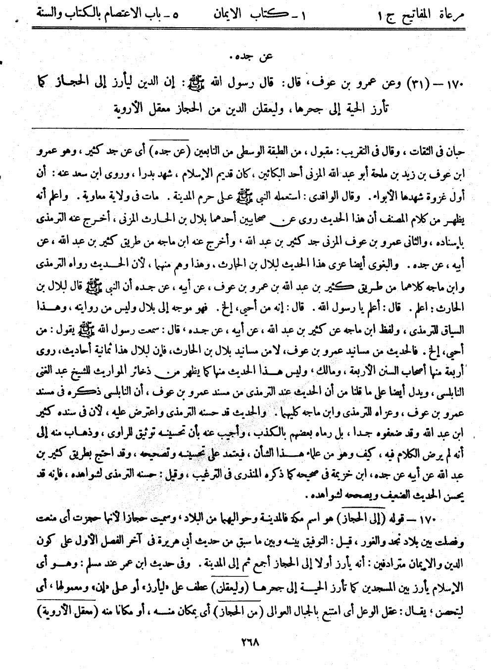 170- (31) وعن عمرو بن عوف قال: قال رسول الله - صلى الله عليه وسلم -: ((إن الدين ليأرز إلى الحجاز كما تأرز الحية إلى جحرها، وليعقلن الدين من الحجاز معقل الأروية