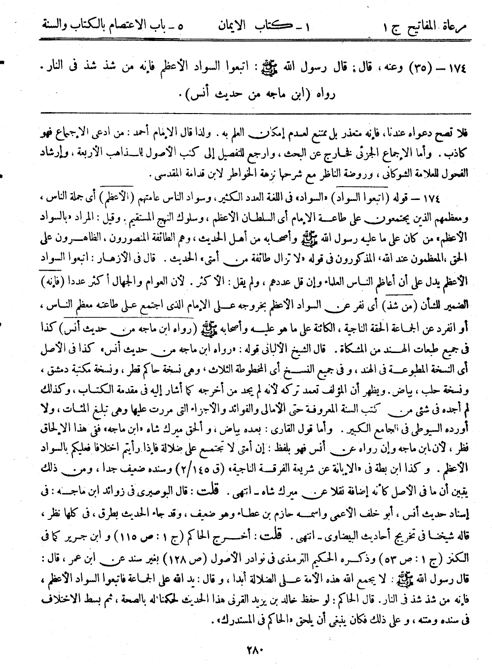174- (35) وعنه قال: قال رسول الله - صلى الله عليه وسلم -: ((اتبعوا السواد الأعظم، فإنه من شذ شذ في النار)) . رواه ابن ماجه من حديث أنس.