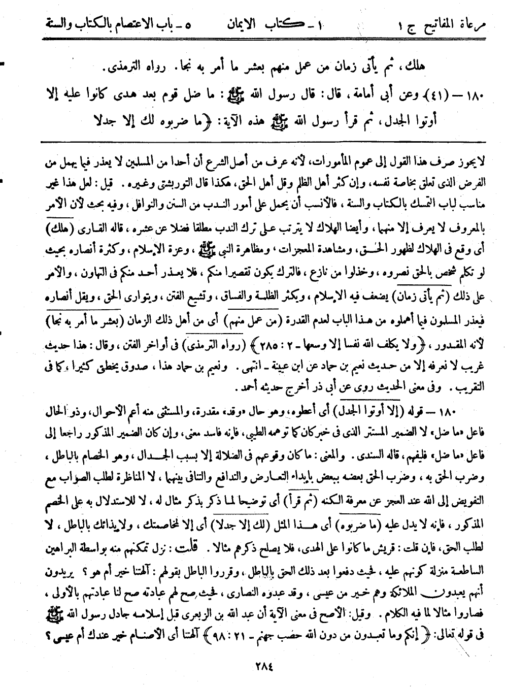 180- (41) وعن أبي أمامة قال: قال رسول الله - صلى الله عليه وسلم -: ((ما ضل قوم بعد هدى كانوا عليه إلا أوتوا الجدل، ثم قرأ رسول الله - صلى الله عليه وسلم - هذه الآية: {ماضربوه لك إلا جدلاً