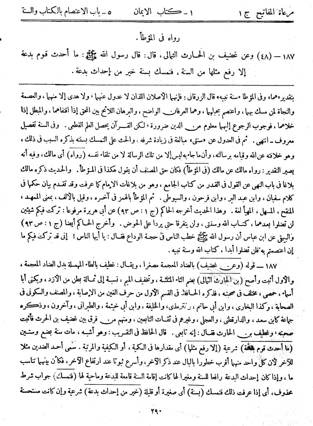 187- قوله: (وعن غضيف) بالضاد المعجمة مصغراً، ويقال: غطيف بالطاء المهملة بدل الضاد المعجمة، والأول أثبت وأصح، (بن الحارث الثمالي) بضم الثاء المثلثة، وتخفيف الميم، نسبة إلى ثمالة بطن من الأزد، ويكنى أبا أسماء، حمصي، مختلف في صحبته، فذكره الحافظ في القسم الأول من حرف الغين من الإصابة، والمصنف والسكوني في الصحابة، وكذا البخاري، وابن أبي حاتم، والترمذي، والخليفة، وابن أبي يخيثمة، والطبراني، وآخرون، وذكره جماعة كابن سعد، والدارقطني، والعجلى، وغيرهم في ثقات التابعين، ومنهم من فرق بين غضيف بن الحرث فأثبت صحبته، وغطيف بن الحارث فقال: إنه تابعي. قال الحافظ في التقريب: وهو أشبه، مات سنة بضع وستين. (ما أحدث قوم بدعة) شرعية (إلا رفع مثلها) أي مقدارها في الكمية، أو الكيفية والمرتبة. سمى أحد الضدين مثلاً للآخر؛ لأن كل واحد منهما أقرب خطوراً بالبال عند ذكر الآخر، وأسرع ثبوتاً عند ارتفاع الآخر، فكأن بينهما تناسب ما، وإذا كان إحداث البدعة رافعاً للسنة ومغيراً لها كانت إقامة السنة قامعة للبدعة وماحية لها. (فتمسك) جواب شرط محذوف، أي إذا عرفت ذلك فتمسك (بسنة) أي صغيرة أو قليلة (خير من إحداث بدعة) شرعية، وإن كانت مستحسنة