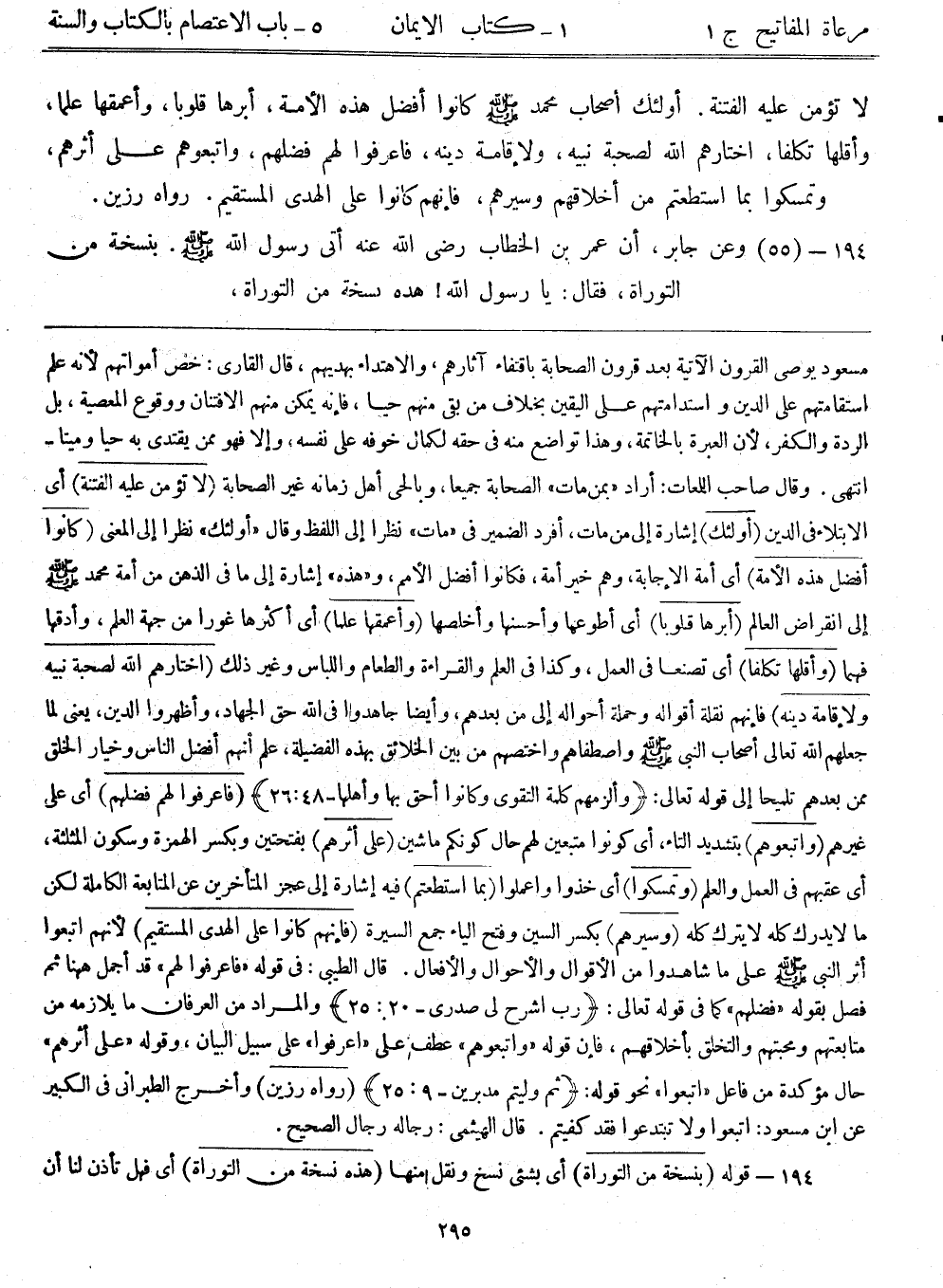 194- (55) وعن جابر، أن عمر بن الخطاب - رضي الله عنه - أتى رسول الله - صلى الله عليه وسلم - بنسخة من التوراة، فقال: يار سول الله - صلى الله عليه وسلم - هذه نسخة من التوراة،