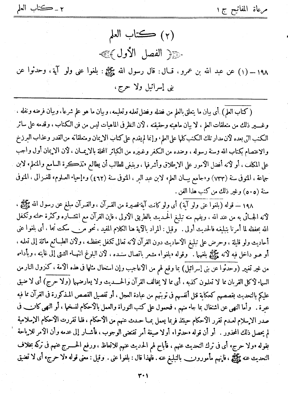 198- (1) عن عبد الله بن عمرو قال: قال رسول الله - صلى الله عليه وسلم -: ((بلغوا عني ولو آية، وحدثوا عن بني إسرائيل ولا حرج،