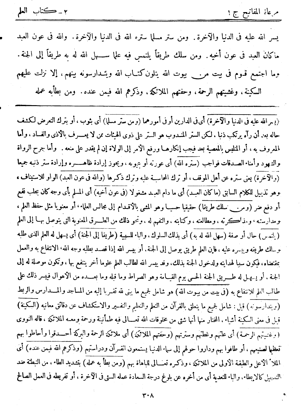 (يسرالله عليه في الدنيا والآخرة) أي في الدارين أو في أمورهما. (ومن ستر مسلماً) أي بثوب، أو بترك التعرض لكشف حاله بعد أن رآه يرتكب ذنباً. لكن الستر المندوب هو الستر على ذوي الهيئات ممن لا يعرف بالأذى والفساد، وأما المعروف به، أو المتلبس بالمعصية بعد فيجب إنكارها ورفع الأمر إلى الولاة إن لم يقدر على منعه. وأما جرح الرواة والشهود وأمناء الصدقات فواجب. (ستره الله) أي عورته أو عيوبه، ويجوز إرادة ظاهره وإرادة ستر ذنبه جميعاً. (والآخرة) يعني ستره عن أهل الموقف، أو ترك المحاسبة عليه وترك ذكرها. (والله في عون العبد) الواو للاستئناف، وهو تذييل للكلام السابق. (ما كان العبد) أي ما دام العبد مشغولاً (في عون أخيه) أي المسلم بأي وجه كان يجلب نفع أو دفع ضر. (ومن سلك طريقاً) حقيقياً حسياًً وهو المشي بالأقدام إلى مجالس العلماء أو معنوياً مثل حفظ العلم ومدارسته ومذاكرته ومطالعته وكتابته والتفهم له، ونحو ذلك من الطرق المعنوية التي يتوصل بها إلى العلم. (يلتمس) حال أو صفة (سهل الله به) أي بذلك السلوك، والباء للسببية (طريقاً إلى الجنة) أي يسهل له العلم الذي طلبه وسلك طريقه وبيسره عليه، فإن العلم طريق يوصل إلى الجنة، أو بيسرالله إذا قصد بطلبه وجه الله، الانتفاع به والعمل بمقتضاه، فيكون سبباً لهدايته ولدخول الجنة بذلك، وقد بيسرالله لطالب العلم علوماً أخر ينتفع بها، وتكون موصلة له إلى الجنة، أو يسهل له طريق الجنة الحسي يوم القيامة وهو الصراط وما قبله وما بعده من الأهوال فبيسر ذلك على طالب العلم للانتفاع به. (في بيت من بيوت الله) هو شامل لجميع ما يبنى لله تقرباً إليه من المساجد والمدارس والربط. (ويتدارسونه) قيل: شامل لجميع ما يتعلق بالقرآن من التعلم والتعليم والتفسير والاستكشاف عن دقائق معانيه. (السكينة) قيل في معنى السكينة أشياء، المختار منها أنها شيء من مخلوقات الله تعالى فيه طمأنينة ورحمة ومعه الملائكة، قاله النووي. (وغشيتهم الرحمة) أي علتهم وغطتهم وسترتهم (وحفتهم الملائكة) أي ملائكة الرحمة والبركة أحدقوا وأحاطوا بهم تعظيماً لصنيعهم، أو طافوا بهم وداروا حولهم إلى سماء الدنيا يستمعون القرآن ودراستهم. (وذكرهم الله فيمن عنده) أي الملأ الأعلى والطبقة الأولى من الملائكة، وذكره تعالى للمباهاة بهم. (ومن بطأ به عمله) بتشديد الطاء، من التبطئة ضد التعجيل كالإبطاء، والباء للتعدية أي من أخره عن بلوغ درجة السعادة عمله السيء في الآخرة، أو تفريطه في العمل الصالح