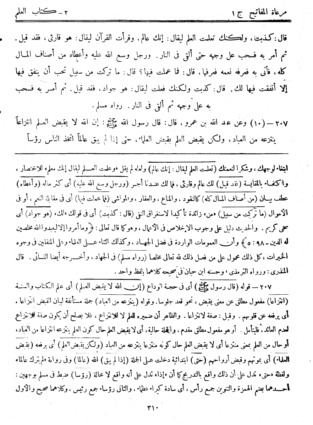 207- قوله: (قال رسول الله - صلى الله عليه وسلم -) أي في حجة الوداع. (إن الله لا يقبض العلم) أي علم الكتاب والسنة (انتزاعاً) مفعول مطلق عن معنى يقبض، نحو قعد جلوساً. وقوله (ينتزعه من العباد) جملة مستأنفة لبيان القبض انتزاعاً، أي يرفعه عن قلوبهم. وقيل: صفة لانتزاعاً. والظاهر أن ضميره للعلم لا للانتزاع، فلا يصلح أن يكون صفة للانتزاع لعدم العائد، فليتأمل. أو هو مفعول مطلق مقدم، والجملة حالية، أي لا يقبض العلم حال كون العلم ينتزعه انتزاعاً من العباد، أو حال من العلم بمعنى منتزعاً أي لا يقبض العلم حال كونه منتزعاً ينتزعه من العباد. (ولكن يقبض العلم) أي يرفعه (بقبض العلماء) أي بموتهم وقبض أرواحهم. (حتى) ابتدائية دخلت على الجملة (إذا لم يبق) الله (عالماً) وفي رواية "لم يترك عالماً" ولفظه "حتى" تدل على أن ذلك واقع بالتدريج كما أن "إذا" تدل على أنه واقع لا محالة. (رؤساء) ضبط في مسلم بوجهين: أحدهما بضم الهمزة والتنوين جمع رأس، أي سادة كبراء عظماء، والثاني رؤساء جمع رئيس، وكلاهما صحيح، والأول