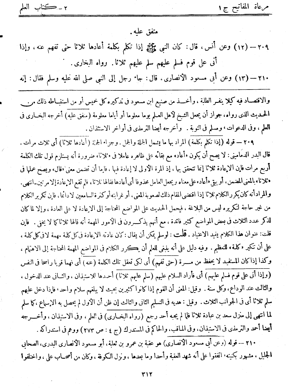 209- (12) وعن أنس قال: ((كان النبي - صلى الله عليه وسلم - إذا تكلم بكلمة أعادها ثلاثاً حتى تفهم عنه، وإذا أتى على قوم فسلم عليهم سلم عليهم ثلاثاً)) رواه البخاري.