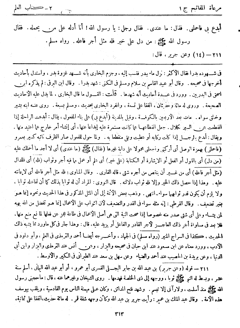 في شهوده بدراً فقال الأكثر: نزل ماء ببدر فنسب إليه، وجزم البخاري بأنه شهد غزوة بدر، واستدل بأحاديث أخرجها في صحيحه. وقال أبوعبيد القاسم بن سلام ومسلم في الكنى: شهد بدراً. وقال ابن البرقي: لم يذكره ابن إسحاق في البدريين. وورد في عدة أحاديث أنه شهدها. قلت: القول ما قال البخاري؛ لما يدل عليه الأحاديث الصحيحة. وروي له مائة وحديثان، اتفقا على تسعة، وانفرد البخاري بحديث، ومسلم بسبعة. روى عنه ابنه بشير وخلق سواه. مات بعد الأربعين بالكوفة، وقيل: بالمدينة. (أبدع بي) على بناء المفعول، يقال: أبدعت الراحلة إذا انقطعت عن السير مكلال. جعل انقطاعها عما كانت مستمرة عليه إبداعاً عنها، أي إنشاء أمر خارج عما أعتيد منها. ويقال: أبدع بالرجل إذا كلت ركابه أو عطبت وبقي منقطعاً به. ولما حول للمفعول صار الظرف نائبه كسير بعمرو. (فاحملني) بهمزة الوصل أي أركبني واجعلني محمولاً على دابة غيرها. (فقال) - صلى الله عليه وسلم - (ما عندي) أي لا أجد ما أحملك عليه. (من دل) أي بالقول أو الفعل أو الإشارة أو الكتابة (على خير) أي علم أو عمل مما فيه أجر وثواب. (فله) أي فللدال (مثل أجر فاعله) أي من غير أن ينقص من أجره شيء، قاله القاري. وقال المناوي: فله مثل أجر فاعله أي لإعانته عليه. وهذا إذا حصل ذلك الخير وإلا فله ثواب دلالته. قال النووي: المراد أن له ثواباً بذلك كما أن لفاعله ثواباً. ولا يلزم أن يكون قدر ثوابهما سواء – انتهى. وذهب بعض الأئمة إلى أن المثل المذكور في هذا الحديث ونحوه إنما هو بغير تضعيف. وقال القرطبي: إنه مثله سواء في القدر والتضعيف؛ لأن الثواب على الأعمال إنما هو تفضل من الله، يهبه لم يشاء وعلى أي شيء صدر منه خصوصاً إذا صحت النية التي هي أصل الأعمال في طاعته عجز عن فعلها لمانع منع منها. فلا بُعد في مساواة أجر ذلك العاجز لأجر القادر والفاعل أو يزيد عليه، قال: وهذا جارٍ في كل ماورد مما يشبه ذلك الحديث، كذا في السراج المنير. (رواه مسلم) في الجهاد، وأخرجه أيضاً أحمد والترمذي في العلم، وأبوداود في الأدب، وورد معناه عن ابن مسعود عند ابن حبان في صحيحه والبزارة، وعن أنس عند الترمذي والبزار وابن أبي الدنيا، وعن بريدة بن الحصيب عند أحمد والضياء، وعن سهل بن سعد عند الطبراني في الكبير والأوسط.