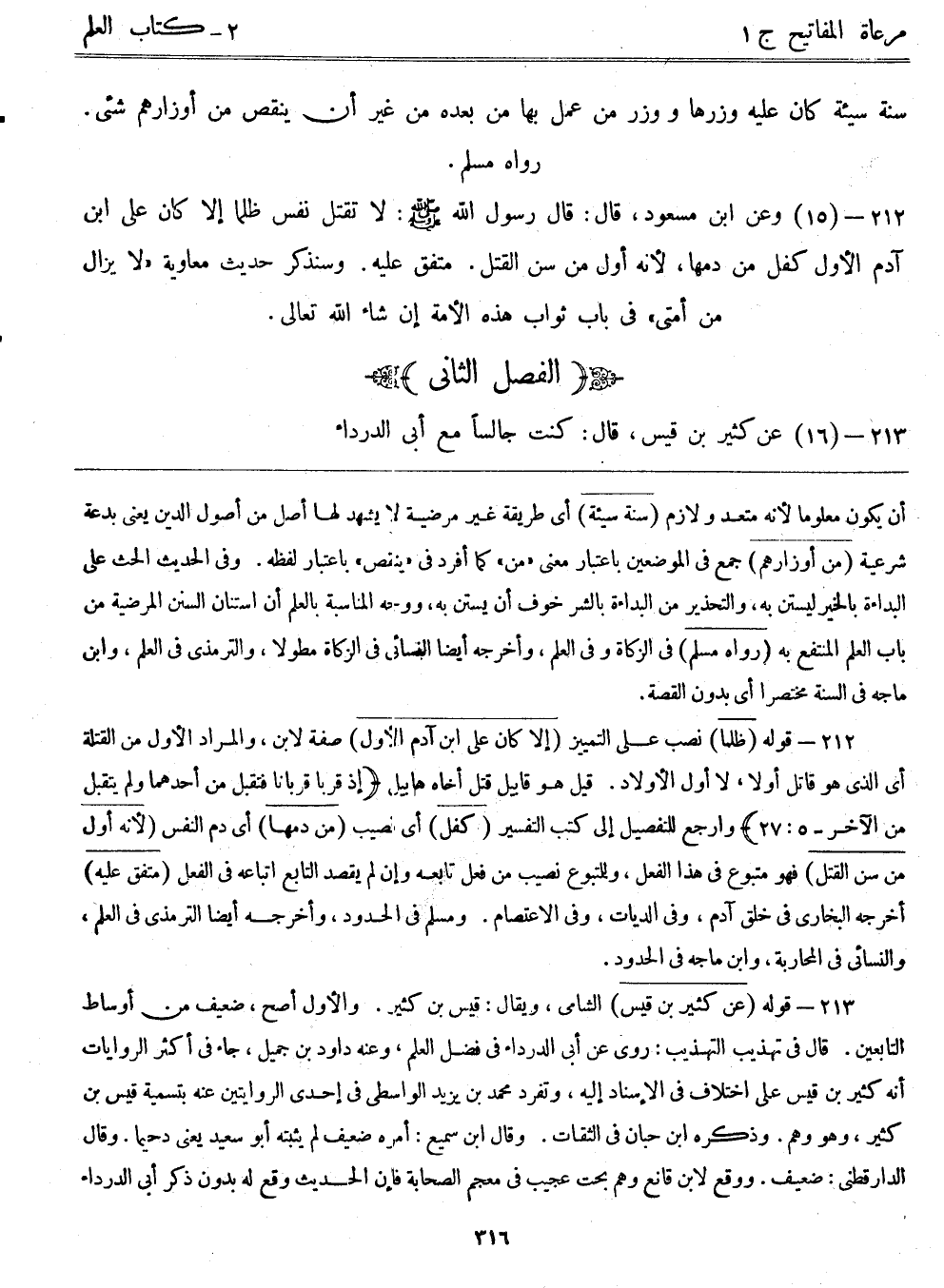 212- قوله: (ظلماً) نصب على التمييز (إلا كان على ابن آدم الأول) صفة لابن، والمراد الأول من القتلة، أي الذي هو قاتل أولاً، لا أول الأولاد. قيل: هو قابيل قتل أخاه هابيل. {إذ قربا قرباناً فتقبل من أحدهما ولم يتقبل من الآخر} [27:5] . وراجع للتفصيل إلى كتب التفسير. (كفل) أي نصيب (من دمها) أي دم النفس (لأنه أول من سن القتل) فهو متبوع في هذا الفعل، وللمتبوع نصيب من فعل تابعه وإن لم يقصد التابع إتباعه في الفعل. (متفق عليه) أخرجه البخاري في خلق آدم، وفي الديات، وفي الاعتصام. ومسلم في الحدود، وأخرجه أيضاً الترمذي في العلم، والنسائي في المحاربة، وابن ماجه في الحدود.