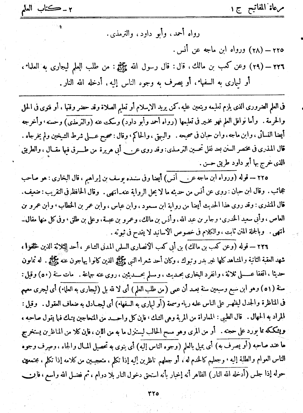 226- قوله: (وعن كعب بن مالك) بن أبي كعب الأنصاري السلمي المدني الشاعر، أحد الثلاثة الذين خلفوا، شهد العقبة الثانية والمشاهد كلها غير بدر وتبوك، وكان أحد شعراء النبي - صلى الله عليه وسلم - الذين كانوا يهاجون عنه - صلى الله عليه وسلم -. له ثمانون حديثاً، اتفقا على ثلاثة، وانفرد البخاري بحديث، ومسلم بحديثين، روى عنه جماعة. مات سنة (50) وقيل: سنة (51) وهو ابن سبع وسبعين سنة بعد أن عمي. (من طلب العلم) أي لا لله بل (ليجاري به العلماء) أي ليجري معهم في المناظرة والجدل ليظهر على الناس علمه رياء وسمعة. (أو ليماري به السفهاء) أي ليجادل به ضعاف العقول. وقيل: المراد به الجهال. قال الطيبي: المماراة من المرية وهي الشك، فإن كل واحد من المتحاجين يشك فيما يقول صاحبه، ويشككه مما يورد على حجته. أو من المرى وهو مسح الحالب ليستنزل ما به من اللبن، فإن كلا من المناظرين يستخرج ما عند صاحبه. (أو يصرف به) أي يميل بالعلم (وجوه الناس إليه) أي ينوى به تحصيل المال والجاه، وصرف وجوه الناس العوام والطلبة إليه، وجعلهم كالخدم له، أو جعلهم ناظرين إليه إذا تكلم، متعجبين من كلامه إذا تكلم، مجتمعين حوله إذا جلس. (أدخله الله النار) الظاهر أنه إخبار بأنه استحق دخول النار بلا دوام، ثم فضل الله واسع، فإن