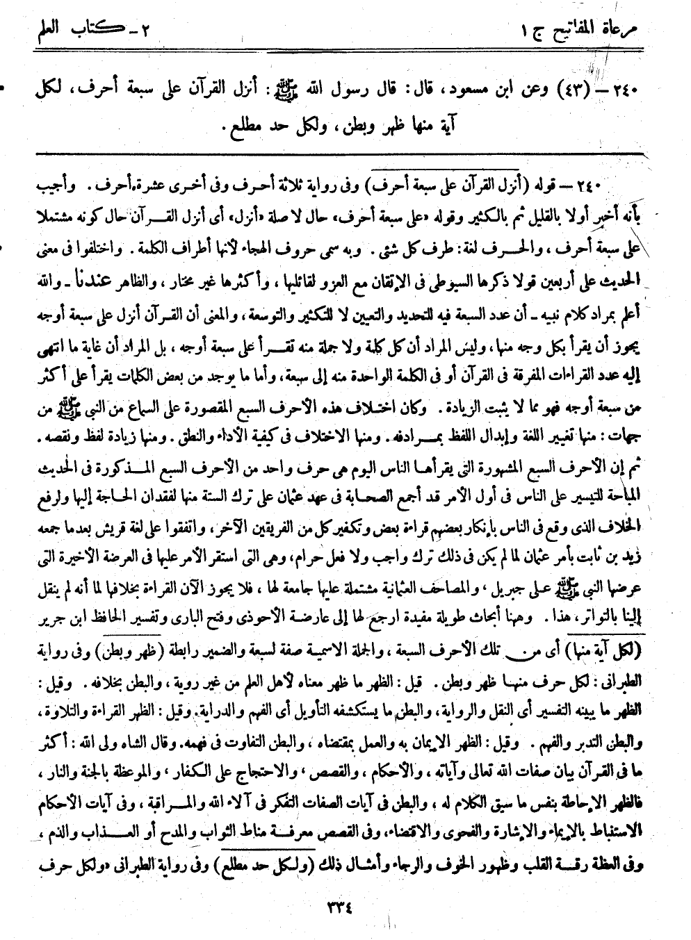 240- (43) وعن ابن مسعود قال: قال رسول الله - صلى الله عليه وسلم -: ((أنزل القرآن على سبعة أحرف، لكل آية منها ظهر وبطن، ولكل حد مطلع))