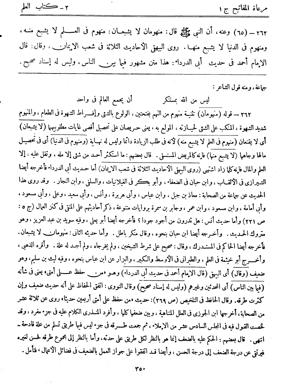 262- قوله: (منهومان) تثنية منهوم من النهم بفتحتين، الولوع بالشيء وإفراط الشهوة في الطعام، والمنهوم شديد الشهوة، المنكب على الشيء لحيازته، المولع به، يعني حريصان على تحصيل أقصى غايات مطلوبيهما. (لايشبعان) أي لا يقنعان (منهوم في العلم لا يشبع منه) ؛ لأنه في طلب الزيادة دائماً وليس له نهاية (ومنهوم في الدنيا) أي في تحصيل مالها وجاهها (لا يشبع منها) فإنه كالمريض المستسقى. قال بعضهم: ما استكثر أحد من شيء إلا مله، وثقل عليه، إلا العلم والمال فإنه كلما زاد اشتهى. (روى البيهقي الأحاديث الثلاثة في شعب الإيمان) أما حديث أبي الدرداء فأخرجه أيضاً الشيرازى في الألقاب، وابن حبان في الضعفاء، وأبوبكر في الغيلانيات، والسلفي، وابن النجار. وقد روي هذا الحديث عن جماعة من الصحابة: معاذ بن جبل، وابن عباس، وأبي هريرة، وأنس، وأبي سعيد، وعلي، وأبي مسعود، وأبي أمامة، وابن مسعود، وابن عمر، وجابر بن سمرة بروايات متنوعة، ذكر أحاديثهم علي المتقى في كنز العمال (ج5:ص221) ، وأما حديث أنس: ((هل تدرون من أجود جوداً؟)) فأخرجه أيضاً أبويعلى، وفيه سويد بن عبد العزيز، وهو متروك الحديث. وأخرجه أيضاً ابن حبان بنحوه، وقال: منكر باطل. وأما حديثه الثاني: ((منهومان لا يشببعان)) . فأخرجه أيضاً الحاكم في المستدرك، وقال: صحيح على شرط الشيخين، ولم يخرجاه، ولم أجد له علة. وأقره الذهبي، وأخرج أبوخيثمة في العلم، والطبراني في الأوسط والكبير، والبزار عن ابن عباس بنحوه، وفيه ليث بن سليم، وهو ضعيف. (وقال) أي البيهقي (قال الإمام أحمد في حديث أبي الدرداء) وهو "من حفظ على أمتي" يعني في شأنه. (فيما بين الناس) أي المحدثين وغيرهم (وليس له إسناد صحيح) ، وقال النووي: اتفق الحفاظ على أنه حديث ضعيف وإن كثرت طرقه. وقال الحافظ في التلخيص (ص269) : حديث "من حفظ على أمتي أربعين حديثاً" روي عن ثلاثة عشر من الصحابة، أخرجها ابن الجوزي في العلل المتناهية، وبين ضعفها كلها، وأفرد المنذري الكلام عليه في جزء مفرد، وقد لخصت القول فيه في المجلس السادس عشر من الإملاء، ثم جمعت طرقه في جزء ليس فيها طريق تسلم من علة قادحة- انتهى. قال بعضهم: الحكم عليه بالضعف إنما هو بالنظر لكل طريق على حدته، وأما بالنظر إلى مجموع طرقه فحسن لغيره، فيرتقي عن درجة الضعف إلى درجة الحسن، وأيضاً قد اتفقوا على جواز العمل بالضعيف في فضائل الأعمال، فتأمل.