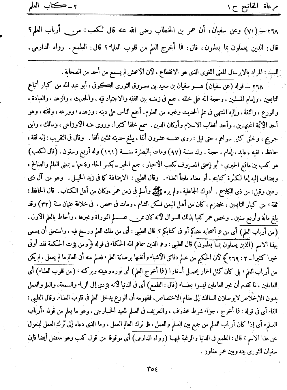 268- (71) وعن سفيان أن عمر بن الخطاب - رضي الله عنه - قال لكعب: "من أرباب العلم"؟ قال: "الذين يعملون بما يعلمون"، قال: "فما أخرج العلم من قلوب العلماء"؟ قال: "الطمع"، رواه الدارمي.