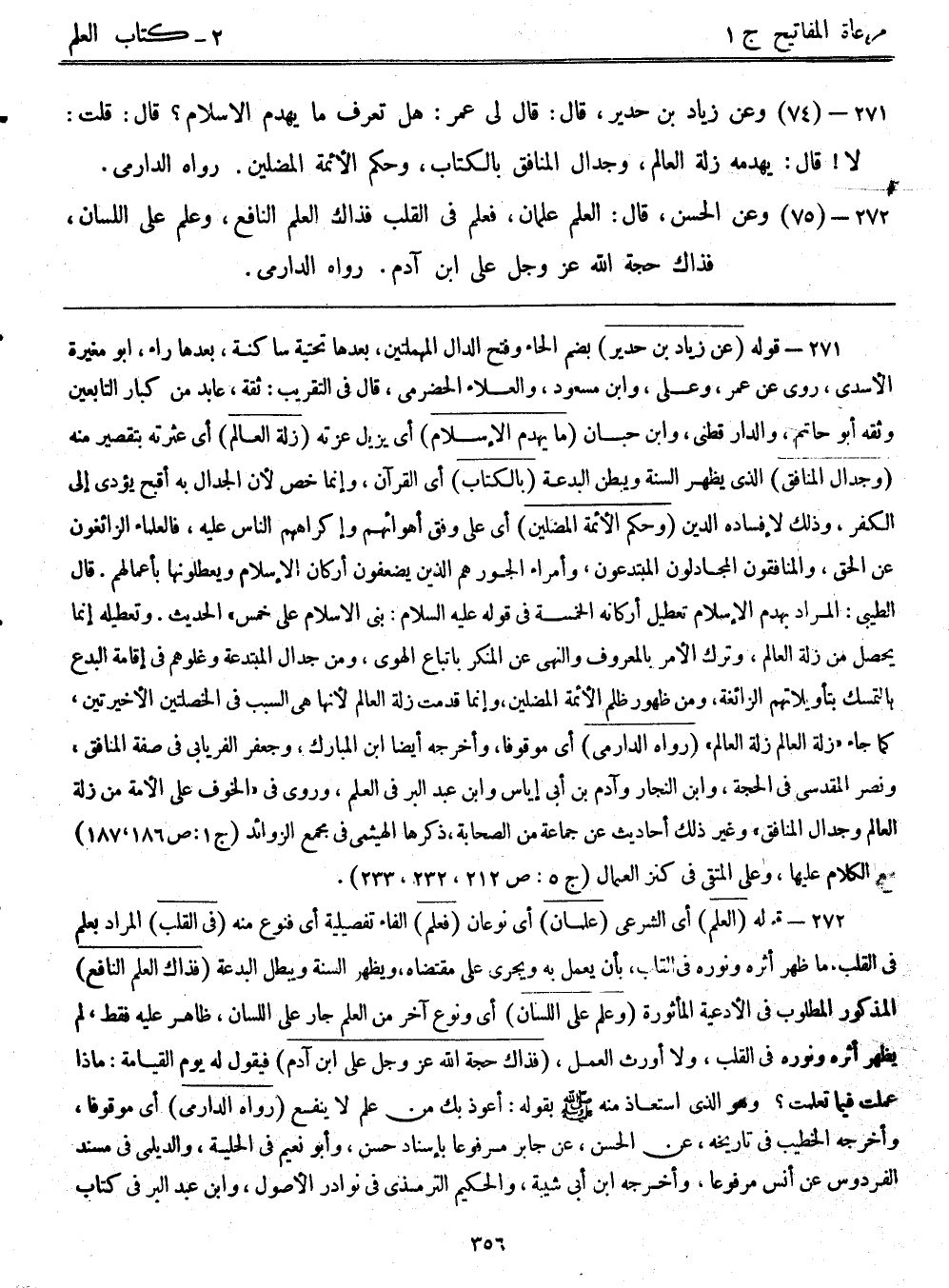 271- قوله: (عن زياد بن حدير) بضم الحاء وفتح الدال المهملتين، بعدها تحتية ساكنة، بعدها راء، أبومغيرة الأسدى، روى عن عمر، وعلي، وابن مسعود، والعلاء الحضرمي، قال في التقريب: ثقة، عابد من كبار التابعين وثقة أبوحاتم، والدارقطني، وابن حبان. (مايهدم الإسلام) أي يزيل عزته. (زلة العالم) أي عثرته بتقصير منه (وجدال المنافق) الذي يظهر السنة ويبطن البدعة. (بالكتاب) أي القرآن، وإنما خص لأن الجدال به أقبح يؤدى إلى الكفر، وذلك لإفساده الدين. (وحكم الأئمة المضلين) أي على وفق أهوائهم وإكراههم الناس عليه، فالعلماء الزائغون عن الحق، والمنافقون المجادلون المبتدعون، وأمراء الجور هم الذين يضعفون أركان الإسلام ويعطلونها بأعمالهم. قال الطيبي: المراد بهدم الإسلام تعطيل أركانه الخمسة في قوله: - عليه السلام -: "بنى الإسلام على خمس" الحديث. وتعطيله إنما يحصل من زلة العالم، وترك الأمر بالمعروف والنهي عن المنكر بإتباع الهوى، ومن جدال المبتدعة وغلوهم في إقامة البدع بالتمسك بتأويلاتهم الزائغة، ومن ظهور ظلم الأئمة المضلين، وإنما قدمت زلة العالم؛ لأنها هي السبب في الخصلتين الأخيرتين، كما جاء "زلة العالِم زلة العالَم". (رواه الدارمي) أي موقوفاً، وأخرجه أيضاً ابن المبارك، وجعفر الفريابي في صفة المنافق، ونصر المقدسي في الحجة، وابن النجار وآدم بن أبي إياس وابن عبد البر في العلم، وروي في "الخوف على الأمة من زلة العالم وجدال المنافق" وغير ذلك أحاديث عن جماعة من الصحابة، ذكرها الهيثمى في مجمع الزوائد (ج1:ص186، 187) مع الكلام عليها، وعلي المتقى في كنزل العمال (ج5:ص212، 232، 233) .