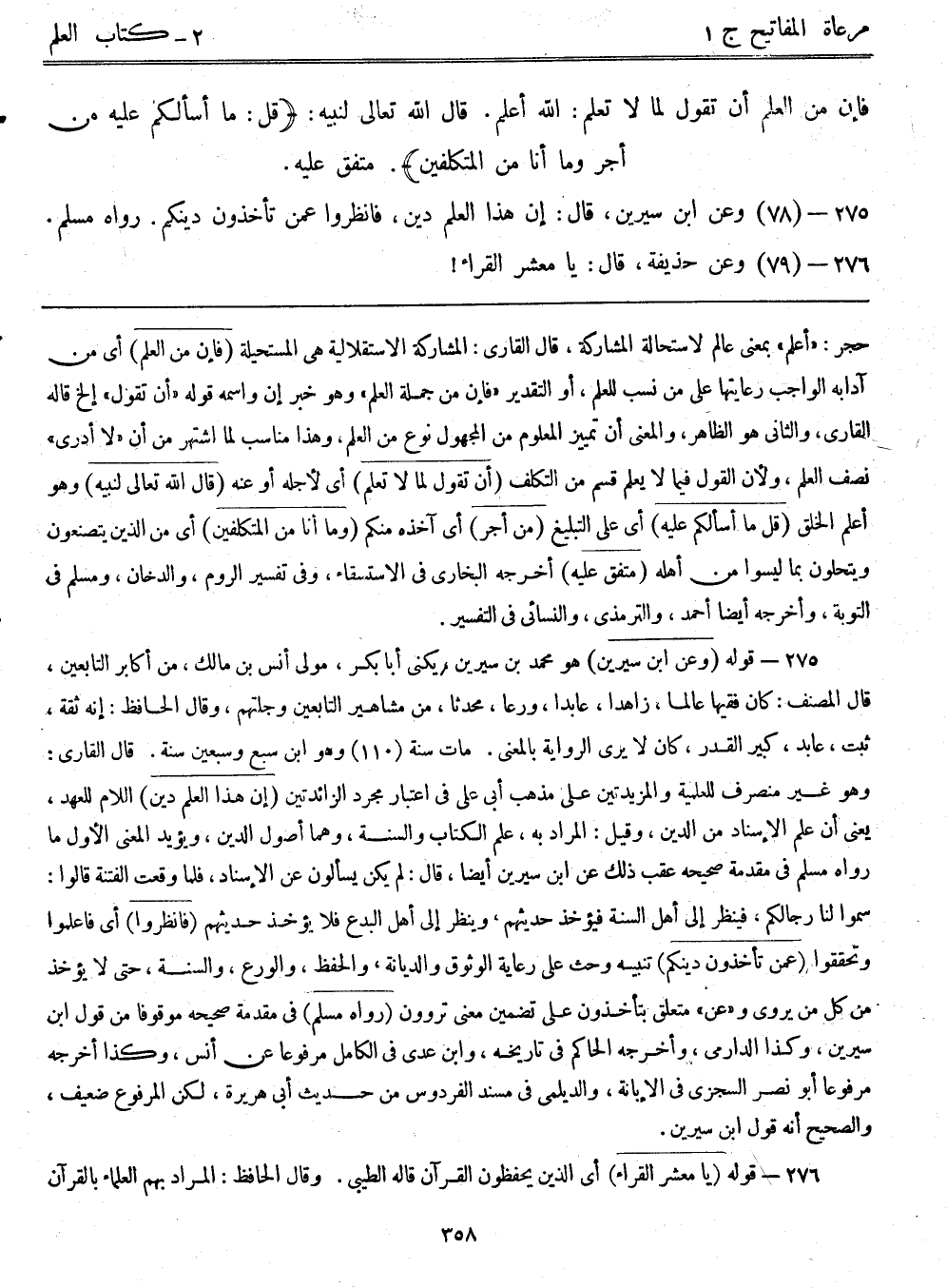 275- قوله: (وعن ابن سيرين) هو محمد بن سيرين، يكنى أبابكر، مولى أنس بن مالك، من أكابر التابعين، قال المصنف: كان فقيهاً عالماً، زاهداً، عابداً، ورعاً، محدثاً، من مشاهير التابعين وجلتهم، وقال الحافظ: إنه ثقة، ثبت، عابد، كبير القدر، كان لا يرى الرواية بالمعنى. مات سنة (110) وهو ابن سبع وسبعين سنة. قال القاري: وهو غير منصرف للعلمية والمزيدتين على مذهب أبى علي في اعتبار مجرد الزائدتين. (إن هذا العلم دين) اللام للعهد، يعني أن علم الإسناد من الدين، وقيل: المراد به، علم الكتاب والسنة، وهما أصول الدين، ويؤيد المعنى الأول ما رواه مسلم في مقدمة صحيحه عقب ذلك عن ابن سيرين أيضاً، قال: لم يكن يسألون عن الإسناد، فلما وقعت الفتنة قالوا: سموا لنا رجالكم، فينظر إلى أهل السنة فيؤخذ حديثهم، وينظر إلى أهل البدع فلا يؤخذ حديثهم. (فانظروا) أي فاعلموا وتحققوا (عمن تأخذون دينكم) تنبيه وحث على رعاية الوثوق والديانة، والحفظ، والورع، والسنة، حتى لا يؤخذ من كل من يروي، و"عن" متعلق بتأخذون على تضمين معنى تروون. (رواه مسلم) في مقدمه صحيحه موقوفاً من قول ابن سيرين، وكذا الدارمي، وأخرجه الحاكم في تاريخه، وابن عدى في الكامل مرفوعاً عن أنس، وكذا أخرجه مرفوعاً أبونصر السجزي في الإبانة، والديلمي في مسند الفردوس من حديث أبي هريرة، لكن المرفوع ضعيف، والصحيح أنه قول ابن سيرين.
