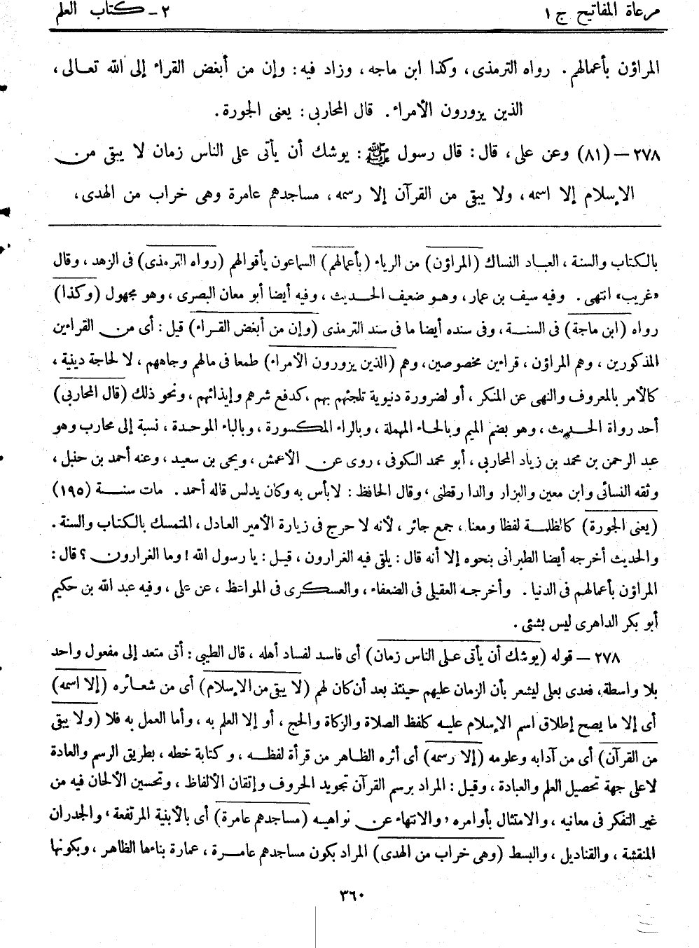 278- قوله: (يوشك أن يأتي على الناس زمان) أي فاسد لفساد أهله، قال الطيبي: أتى متعدٍ إلى مفعول واحد بلا واسطة، فعدي بـ"على" ليشعر بأن الزمان عليهم حينئذٍ بعد أن كان لهم. (لا يبقى من الإسلام) أي من شعائره. (إلا اسمه) أي إلا ما يصح إطلاق اسم الإسلام عليه كلفظ الصلاة والزكاة والحج، أو إلا العلم به، وأما العمل به فلا. (ولا يبقى من القرآن) أي من آدابه وعلومه (إلا رسمه) أي أثره الظاهر من قراءة لفظه، وكتابة خطه، بطريق الرسم والعادة لا على جهة تحصيل العلم والعبادة، وقيل: المراد برسم القرآن تجويد الحروف وإتقان الألفاظ، وتحسين الألحان فيه من غير التفكر في معانيه، والامتثال بأوامره والانتهاء عن نواهيه. (مساجدهم عامرة) أي بالأبنية المرتفعة، والجدران المنقشة، والقناديل والبسط. (وهي خراب من الهدى) المراد بكون مساجدهم عامرة، عمارة بنائها الظاهر، وبكونها
