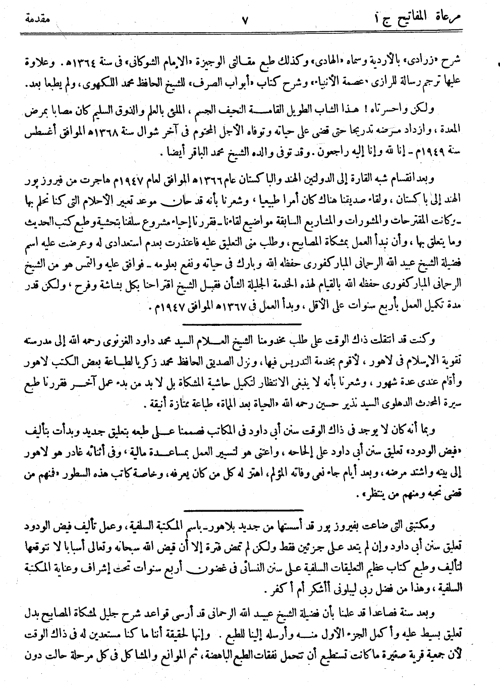 وبعد سنة فصاعداً قد علمنا بأن فضيلة الشيخ عبيد الله الرحماني قد أرسى قواعد شرح جليل لمشكاة المصابيح بدل تعليق بسيط عليه، وأكمل الجزء الأول منه وأرسله إلينا للطبع، وإنها لحقيقة أننا ما كنا مستعدين له في ذاك الوقت؛ لأن جمعية قرية صغيرة ما كانت تستطيع أن تتحمل نفقات الطبع الباهضة، ثم الموانع والمشاكل في كل مرحلة حالت دون