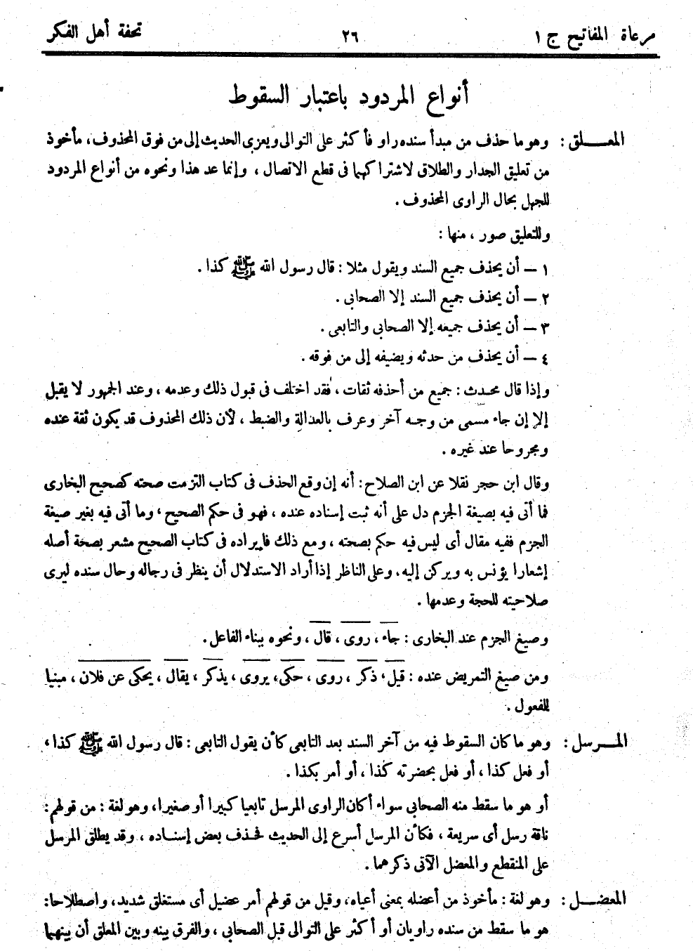 المعلق: وهو ما حذف من مبدأ سنده راوٍ فأكثر على التوالي، ويعزى الحديث إلى من فوق المحذوف، مأخوذ من تعليق الجدار والطلاق لاشتراكهما في قطع الاتصال، وإنما عدّ هذا ونحوه من أنواع المردود للجهل بحال الراوي المحذوف.