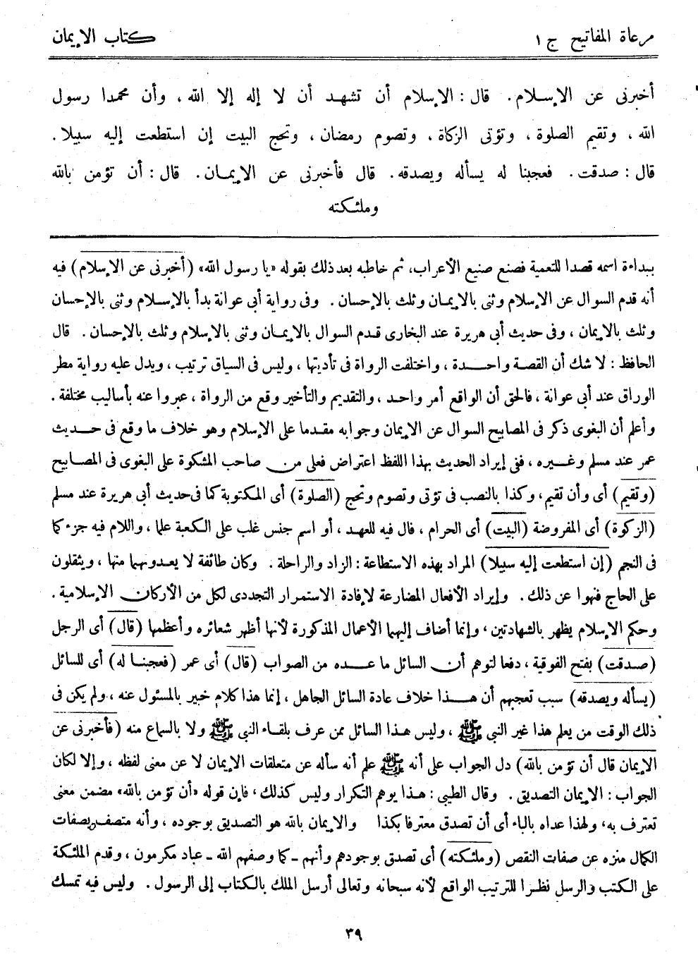ببداءة اسمه قصداً للتعمية، فصنع صنيع الأعراب، ثم خاطبه بعد ذلك بقوله "يا رسول الله"، (أخبرني عن الإسلام) فيه أنه قدم السؤال عن الإسلام وثنى بالإيمان وثلث بالإحسان، وفي رواية أبي عوانة بدأ بالإسلام وثنى بالإحسان وثلث بالإيمان، وفي حديث أبي هريرة عند البخاري قدم السؤال بالإيمان وثنى بالإسلام وثلث بالإحسان، قال الحافظ: لا شك أن القصة واحدة، واختلفت الرواة في تأديتها، وليس في السياق ترتيب، ويدل عليه رواية مطر الوراق عند أبي عوانة، فالحق أن الواقع أمر واحد، والتقديم والتأخير وقع من الرواة، عبروا عنه بأساليب مختلفة. واعلم أن البغوي ذكر في المصابيح السؤال عن الإيمان وجوابه مقدماً على الإسلام، هو خلاف ما وقع في حديث عمر عند مسلم وغيره، ففي إيراد الحديث بهذا اللفظ اعتراض فعلي من صاحب المشكاة على البغوي في المصابيح. (وتقيم) أي وأن تقيم، وكذا بالنصب في تؤتي وتصوم وتحج. (الصلاة) أي المكتوبة كما في حديث أبي هريرة عند مسلم (الزكاة) أي المفروضة (البيت) أي الحرام، قال فيه للعهد، أو اسم جنس غلب على الكعبة علماً، واللام فيه جزء كما في النجم (إن استطعت إليه سبيلاً) المراد بهذه الاستطاعة: الزاد والراحلة، وكان طائفة لا يعدونهما منها، ويثقلون على الحاج فنهو عن ذلك، وإيراد الأفعال المضارعة لإفادة الاستمرار التجددي لكل من الأركان الإسلامية، وحكم الإسلام يظهر بالشهادتين، وإنما أضاف إليهما الأعمال المذكورة لأنها أظهر شعائره وأعظمها. (قال) أي الرجل (صدقت) بفتح الفوقية، دفعاً لتوهم أن السائل ما عده من الصواب (قال) أي عمر (فعجبنا له) أي للسائل (يسأله ويصدقه) سبب تعجبهم أن هذا خلاف عادة السائل الجاهل، إنما هذا كلام خبير بالمسؤول عنه، ولم يكن في ذلك الوقت من يعلم هذا غير النبي - صلى الله عليه وسلم -، وليس هذا السائل ممن عرف بلقاء النبي - صلى الله عليه وسلم - ولا بالسماع منه (فأخبرني عن الإيمان، قال: أن تؤمن بالله) دل الجواب على أنه - صلى الله عليه وسلم - علم أنه سأله عن متعلقات الإيمان لا عن معنى لفظه، وإلا لكان الجواب: الإيمان التصديق، وقال الطيبي: هذا يوهم التكرار وليس كذلك، فإن قوله "أن تؤمن بالله" مضمن معنى تعترف به، ولهذا عداه بالباء أي أن تصدق معترفاً بكذا، والإيمان بالله هو التصديق بوجوده، وأنه متصف بصفات الكمال منَزه عن صفات النقص (وملائكته) أي تصدق بوجودهم وأنهم – كما وصفهم الله – عباد مكرمون، وقدم الملائكة على الكتب والرسل نظراً للترتيب الواقع؛ لأنه سبحانه وتعالى أرسل الملك بالكتاب إلى الرسول، وليس فيه تمسك