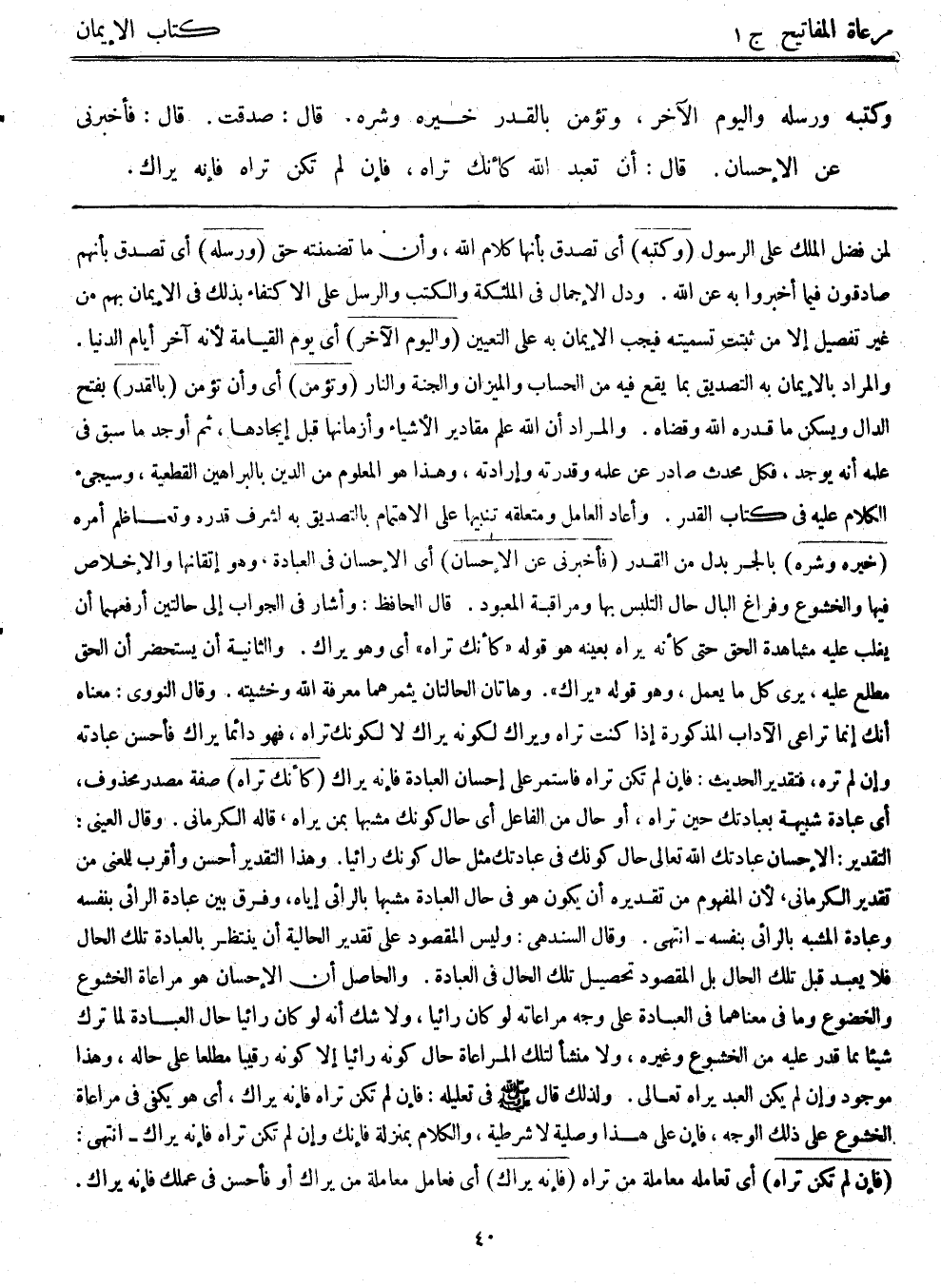 لمن فضل الملك على الرسول. (وكتبه) أي تصدق بأنها كلام الله، وأن ما تضمنته حق (ورسله) أي تصدق بأنهم صادقون فيما أخبروا به عن الله. ودل الإجمال في الملائكة والكتب والرسل على الاكتفاء بذلك في الإيمان بهم من غير تفصيل إلا من ثبتت تسميته فيجب الإيمان به على التعيين. (واليوم الآخر) أي يوم القيامة؛ لأنه آخر أيام الدنيا، والمراد بالإيمان به التصديق بما يقع فيه من الحساب والميزان والجنة والنار، (وتؤمن) أي وأن تؤمن (بالقدر) بفتح الدال ويسكن ما قدره الله وقضاه، والمراد أن الله علم مقادير الأشياء وأزمانها قبل إيجادها، ثم أوجد ما سبق في علمه أنه يوجد، فكل محدث صادر عن علمه وقدرته وإرادته، وهذا هو المعلوم من الدين بالبراهين القطعية، وسيجيء الكلام عليه في كتاب القدر، وأعاد العامل ومتعلقه تنبيهاً على الاهتمام بالتصديق به لشرف قدره وتعاظم أمره. (خيره وشره) بالجر بدل من القدر (فأخبرني عن الإحسان) أي الإحسان في العبادة، وهو إتقانها والإخلاص فيها والخشوع وفراغ البال حال التلبس بها ومراقبة المعبود، قال الحافظ: وأشار في الجواب إلى حالتين أرفعهما أن يغلب عليه مشاهدة الحق حتى كأنه يراه بعينه هو قوله "كأنك تراه" أي وهو يراك، والثانية: أن يستحضر أن الحق مطلع عليه، يرى كل ما يعمل، وهو قوله "يراك"، وهاتان الحالتان يثمرهما معرفة الله وخشيته، وقال النووي: معناه أنك إنما تراعي الآداب المذكورة إذا كنت تراه ويراك لكونه يراك لا لكونك تراه، فهو دائماً يراك فأحسن عبادته وإن لم تره، فتقدير الحديث: فإن لم تكن تراه فاستمر على إحسان العبادة فإنه يراك (كأنك تراه) صفة مصدر محذوف، أي عبادة شبيهة بعبادتك حين تراه، أو حال من الفاعل أي حال كونك مشبهاً بمن يراه، قاله الكرماني، وقال العيني: التقدير: الإحسان عبادتك الله تعالى حال كونك في عبادتك مثل حال كونك رائياً، وهذا التقدير أحسن وأقرب للمعنى من تقدير الكرماني؛ لأن المفهوم من تقديره أن يكون هو في حال العبادة مشبهاً بالرائي إياه، وفرق بين عبادة الرائي بنفسه وعبادة المشبه بالرائي بنفسه – انتهى. وقال السندهي: وليس المقصود على تقدير الحالية أن ينتظر بالعبادة تلك الحال فلا يعبد قبل تلك الحال، بل المقصود تحصيل تلك الحال في العبادة، والحاصل أن الإحسان هو مراعاة الخشوع والخضوع وما ي معناهما في العبادة على وجه مراعاته لو كان رائياً، ولا شك أنه لو كان رائياً حال العبادة لما ترك شيئاً مما قدر عليه من الخشوع وغيره، ولا منشأ لتلك المراعاة حال كونه رائياً إلا كونه رقيباً مطلعاً على حاله، وهذا موجود وإن لم يكن العبد يراه تعالى. ولذلك قال - صلى الله عليه وسلم - في تعليله: فإن لم تكن تراه فإنه يراك، أي هو يكفي في مراعاة الخشوع على ذلك الوجه، فإن على هذا وصلية لا شرطية، والكلام بمنْزلة فإنك وإن لم تكن تراه فإنه يراك – انتهى. (فإن لم تكن تراه) أي تعامله معاملة من تراه (فإنه يراك) أي فعامل معاملة من يراك أو فأحسن في عملك فإنه يراك.