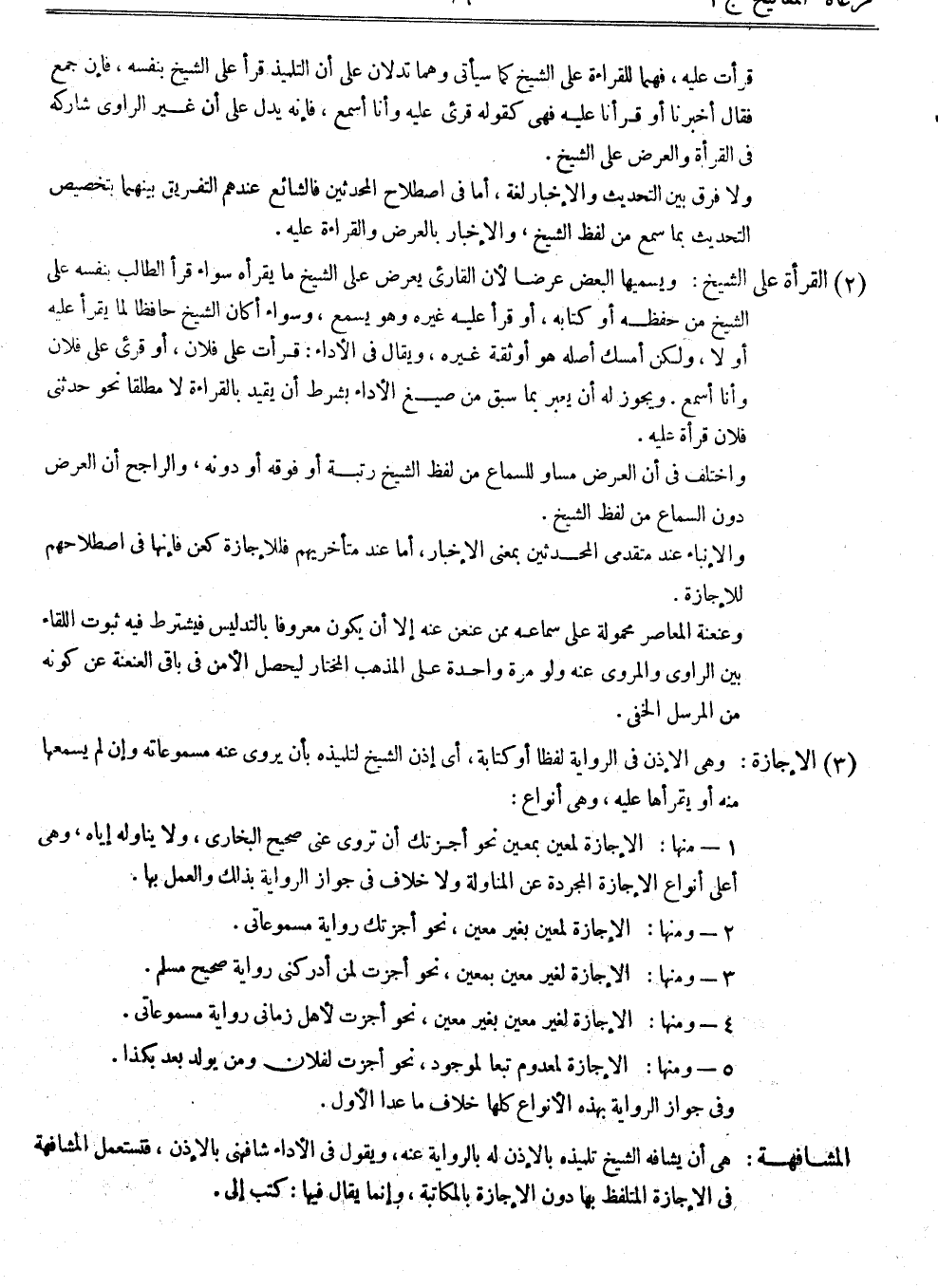 (3) الإجازة: وهي الإذن في الرواية لفظاً أو كتابة، أي إذن الشيخ لتلميذه بأن يروي عنه مسموعاته، وإن لم يسمعها منه أو يقرأها عليه، وهي أنواع: