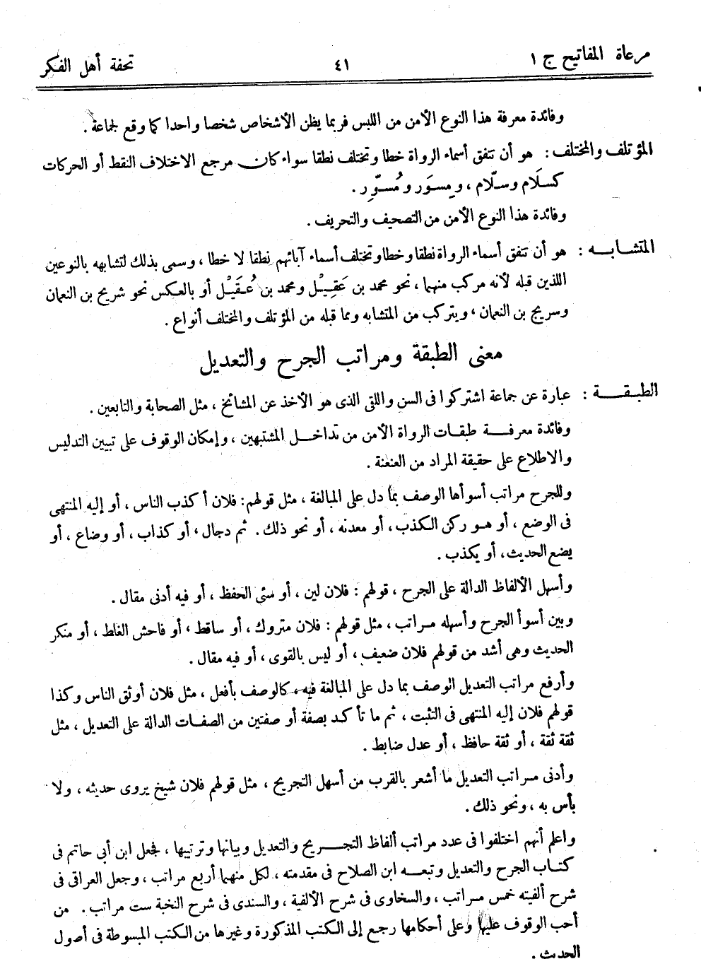 ... واعلم أنهم اختلفوا في عدد مراتب ألفاظ التجريح والتعديل وبيانها وترتيبها، فجعل ابن أبي حاتم في كتاب الجرح والتعديل وتبعه ابن الصلاح في مقدمته، لكل منهما أربع مراتب، وجعل العراقي في شرح ألفيته خمس مراتب، والسخاوي في شرح الألفية، والسندي في شرح النخبة ست مراتب، من أحب الوقوف عليها وعلى أحكامها رجع إلى الكتب المذكورة وغيرها من الكتب المبسوطة في أصول الحديث.
