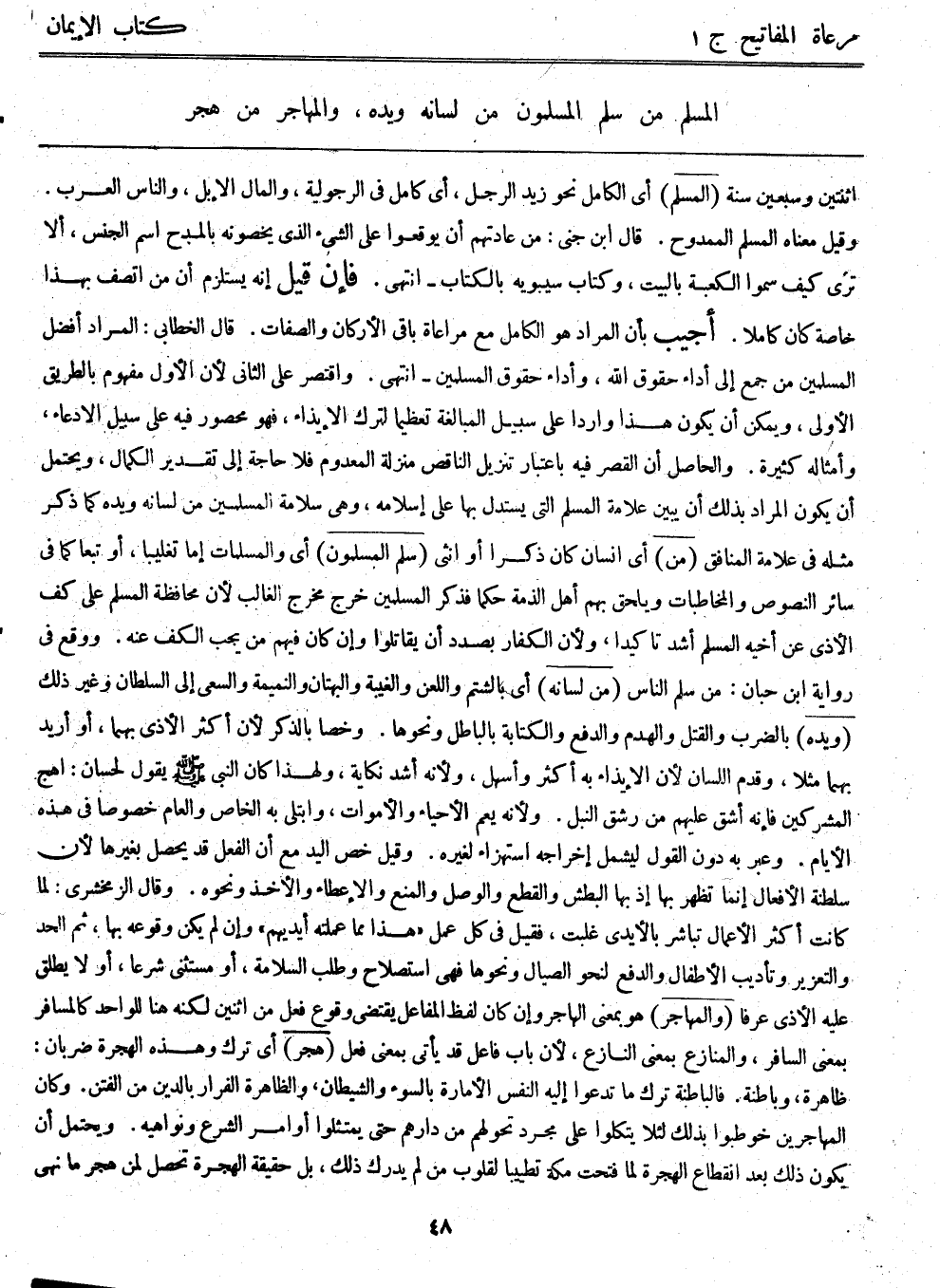 اثنتين وسبعين سنة. (المسلم) أي الكامل، نحو زيد الرجل، أي كامل في الرجولة، والمال الإبل، والناس العرب، وقيل: معناه: المسلم الممدوح، قال ابن جني: من عادتهم أن يوقعوا على الشيء الذي يخصونه بالمدح اسم الجنس، ألا ترى كيف سموا الكعبة بالبيت، وكتاب سيبويه بالكتاب – انتهى. فإن قيل: إنه يستلزم أن من اتصف بهذا خاصة كان كاملاً، أجيب بأن المراد هو الكامل مع مراعاة باقي الأركان والصفات، قال الخطابي: المراد أفضل المسلمين من جمع إلى أداء حقوق الله، وأداء حقوق المسلمين – انتهى. واقتصر على الثاني لأن الأول مفهوم بالطريق الأولى، ويمكن أن يكون هذا وارداً على سبيل المبالغة تعظيماً لترك الإيذاء، فهو محصور فيه على سبيل الادعاء، وأمثاله كثيرة، والحاصل أن القصر فيه باعتبار تنْزيل الناقص منْزلة المعدوم، فلا حاجة إلى تقدير الكمال، ويحتمل أن يكون المراد بذلك أن يبين علامة المسلم التي يستدل بها على إسلامه، وهي سلامة المسلمين من لسانه ويده كما ذكر مثله في علامة المنافق (من) أي إنسان كان ذكراً أو أنثى (سلم المسلمون) أي والمسلمات إما تغليباً، أو تبعاً كما في سائر النصوص والمخاطبات، ويلحق بهم أهل الذمة حكماً، فذكر المسلمين خرج مخرج الغالب؛ لأن محافظة المسلم على كف الأذى عن أخيه المسلم أشد تأكيداً، ولأن الكفار بصدد أن يقاتلوا وإن كان فيهم من يجب الكف عنه، ووقع في رواية ابن حبان: من سلم الناس (من لسانه) أي بالشتم واللعن والغيبة والبهتان والنميمة والسعي إلى السلطان وغير ذلك، (ويده) بالضرب والقتل والهدم والدفع والكتابة بالباطل ونحوها، وخصا بالذكر لأن أكثر الأذى بهما، أو أريد بهما مثلاً، وقدم اللسان لأن الإيذاء به أكثر وأسهل، ولأنه أشد نكاية، ولهذا كان النبي - صلى الله عليه وسلم - يقول لحسان: اهج المشركين فإنه أشق عليه من رشق النبل، ولأنه يعم الأحياء والأموات، وابتلي به الخاص ولعام خصوصاً في هذه الأيام، وعبر به دون القول ليشمل إخراجه استهزاء لغيره، وقيل: خص اليد مع أن الفعل قد يحصل بغيرها لأن سلطنة الأفعال إنما تظهر بها إذ بها البطش والقطع والوصل والمنع والإعطاء والأخذ ونحوه، وقال الزمخشري: لما كانت أكثر الأعمال تباشر بالأيدي غلبت، فقيل في كل عمل "هذا مما عملته أيديهم" وإن لم يكن وقوعه بها، ثم الحد والتعزير وتأديب الأطفال والدفع لنحو الصيال ونحوها فهي استصلاح وطلب السلامة، أو مستثنى شرعاً، أو لا يطلق عليه الأذى عرفاً. (والمهاجر) هو بمعنى الهاجر وإن كان لفظ المفاعل يقتضي وقوع فعل من اثنين لكنه هنا للواحد كالمسافر بمعنى السافر، والمنازع بمعنى النازع، لأن باب فاعل قد يأتي بمعنى فعل (هجر) أي ترك وهذه الهجرة ضربان: ظاهرة، وباطنة، فالباطنة ترك ما تدعوا إليه النفس الأمارة بالسوء والشيطان، والظاهرة الفرار بالدين من الفتن، وكان المهاجرين خوطبوا بذلك لئلا يتكلوا على مجرد تحولهم من دارهم حتى يمتثلوا أوامر الشرع ونواهيه، ويحتمل أن يكون ذلك بعد انقطاع الهجرة لما فتحت مكة تطييباً لقلوب من لم يدرك ذلك، بل حقيقة الهجرة تحصل لمن هجر ما نهى