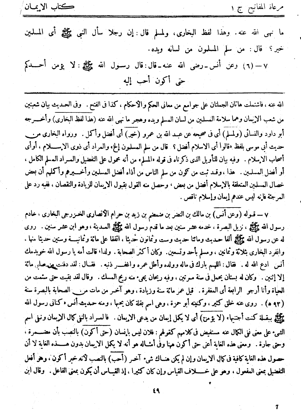 7- قوله: (وعن أنس) بن مالك بن النضر بن ضمضم بن زيد بن حرام الأنصاري الخزرجي النجاري، خادم رسول الله - صلى الله عليه وسلم -، نزيل البصرة، خدمه عشر سنين بعد ما قدم رسول الله - صلى الله عليه وسلم - المدينة، وهو ابن عشر سنين، روي له عن رسول الله - صلى الله عليه وسلم - ألفا حديث ومائتا حديث وست وثمانون حديثاً، اتفقا على مائة وثمانية وستين حديثاً منها، وانفرد البخاري بثلاثة وثمانين، ومسلم بأحد وتسعين، وكان أكثر الصحابة ولداً، قالت أمه: يا رسول الله خويدمك أنس ادع الله له، فقال: اللهم بارك في ماله وولده وأطل عمره واغفر ذنبه، فقال: لقد دفنت من صلبي مائة إلا اثنين، وكان له بستان يحمل في سنة مرتين، وفيه ريحان يجيء منه ريح المسك، وقال لقد بقيت حتى سئمت من الحياة وأنا أرجو الرابعة أي المغفرة، قيل: عمّر مائة سنة وزيادة، وهو آخر من مات من الصحابة بالبصرة سنة (93هـ) ، روى عنه خلق كثير، وكنيته أبوحمزة، وهي اسم بقلة كان يحبها، ومنه حديث أنس: ((كناني رسول الله - صلى الله عليه وسلم - ببقلة كنت أجتنيها)) ، (لا يؤمن) أي لا يكمل إيمان من يدعي الإيمان، فالمراد بالنفي كمال الإيمان ونفي اسم الشيء على معنى نفي الكمال عنه مستفيض في كلامهم كقولهم: فلان ليس بإنسان. (حتى أكون) بالنصب بأن مضمرة، وحتى جارة، ومعنى هذه الغاية أعني حتى أكون ههنا وفي أمثاله هو أنه لا يكمل الإيمان بدون هذه الغاية، لا أن حصول هذه الغاية كافية في كمال الإيمان وإن لم يكن هناك شيء آخر. (أحب) بالنصب لأنه خبر أكون، وهو أفعل التفضيل بمعنى المفعول، وهو على خلاف القياس وإن كان كثيراً، إذ القياس أن يكون بمعنى الفاعل، وقال ابن