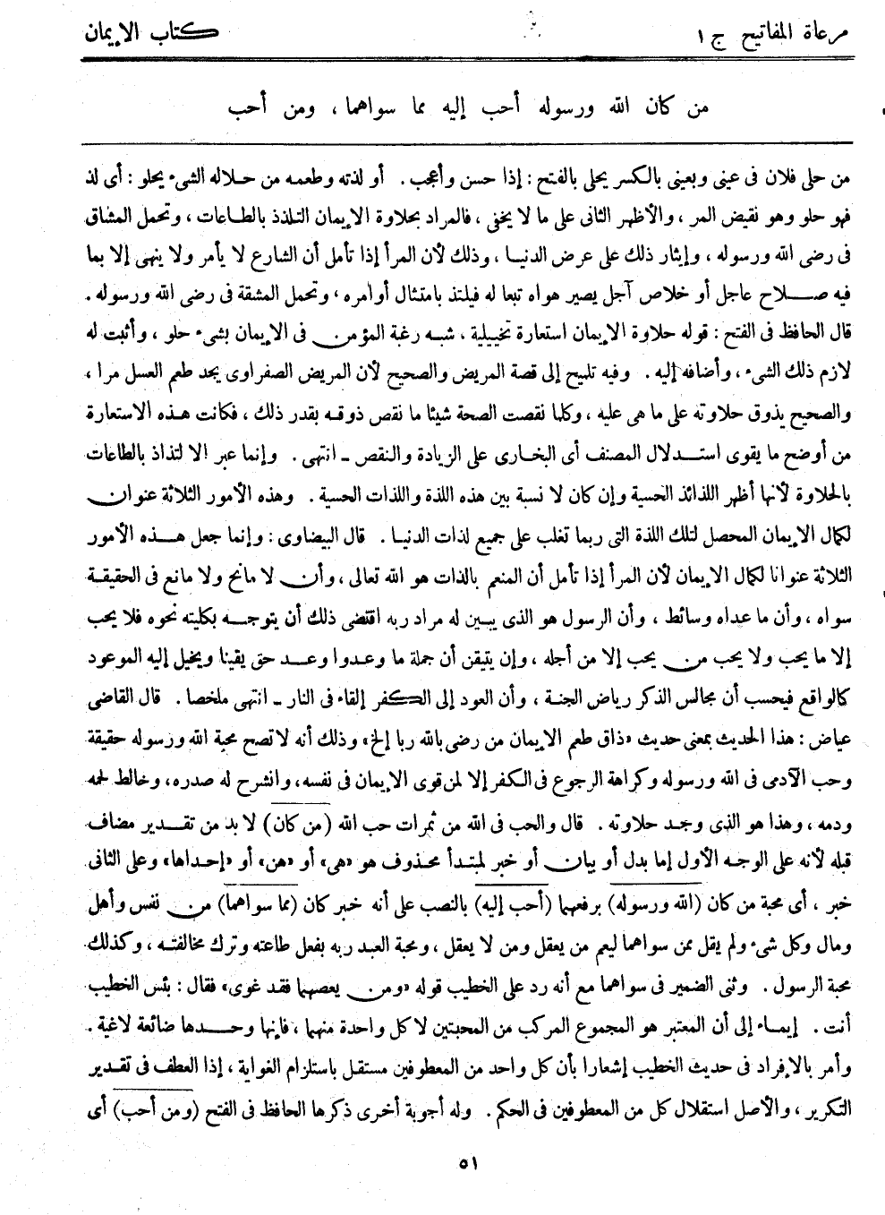 من حلي فلان في عيني وبعيني بالكسر يحلى بالفتح: إذا حسن وأعجب، أو لذته وطعمه من حلاله الشيء يحلو: أي لذ فهو حلو وهو نقيض المر، والأظهر الثاني على ما لا يخفى، فالمراد بحلاوة الإيمان التلذذ بالطاعات، وتحمل المشاق في رضى الله ورسوله، وإيثار ذلك على عرض الدنيا، وذلك لأن المرء إذا تأمل أن الشارع لا يأمر ولا ينهى إلا بما فيه صلاح عاجل أو خلاص آجل يصير هواه تبعاً له فيلتذ بامتثال أوامره، وتحمل المشقة في رضى الله ورسوله، قال الحافظ في الفتح: قوله حلاوة الإيمان استعارة تخييلية، شبه رغبة المؤمن في الإيمان بشيء حلو، وأثبت له لازم ذلك الشيء، وأضافه إليه، وفيه تلميح إلى قصة المريض والصحيح؛ لأن المريض الصفراوي يجد طعم العسل مراً، والصحيح يذوق حلاوته على ما هي عليه، وكلما نقصت الصحة شيئاً ما نقص ذوقه بقدر ذلك، فكانت هذه الاستعارة من أوضح ما يقوي استدلال المصنف أي البخاري على الزيادة والنقص – انتهى. وإنما عبر الالتذاذ بالطاعات بالحلاوة لأنها أظهر اللذائذ الحسية، وإن كان لا نسبة بين هذه اللذة واللذات الحسية، وهذه الأمور الثلاثة عنوان لكمال الإيمان المحصل لتلك اللذة التي ربما تغلب على جميع لذات الدنيا، قال البيضاوي: وإنما جعل هذه الأمور الثلاثة عنواناً لكمال الإيمان لأن المرء إذا تأمل أن المنعم بالذات هو الله تعالى، وأن لا مانح ولا مانع في الحقيقة سواه، وأن ما عداه وسائط، وأن الرسول هو الذي يبين له مراد ربه اقتضى ذلك أن يتوجه بكليته نحوه، فلا يحب إلا ما يحب ولا يحب من يحب إلا من أجله، وإن يتيقن أن جملة ما وعدوا وعد حق يقيناً ويخيل إليه الموعود كالواقع، فيحسب أن مجالس الذكر رياض الجنة، وأن العود إلى الكفر إلقاء في النار – انتهى ملخصاً، قال القاضي عياض: هذا الحديث بمعنى حديث ((ذاق طعم الإيمان من رضي الله رباً ... )) الخ، وذلك أنه لا تصح محبة الله ورسوله حقيقة وحب الآدمي في الله ورسوله وكراهة الرجوع في الكفر إلا لمن قوي الإيمان في نفسه، وانشرح له صدره، وخالط لحمه ودمه، هذا هو الذي وجد حلاوته، قال: والحب في الله من ثمرات حب الله (من كان) لا بد من تقدير مضاف قبله؛ لأنه على الوجه الأول إما بدل أو بيان أو خبر لمبتدأ محذوف هو "هي" أو "هن"، أو "إحداها" وعلى الثاني خبر، أي محبة من كان (الله ورسوله) برفعهما (أحب إليه) بالنصب على أنه خبر كان (مما سواهما) من نفس وأهل ومال وكل شيء، ولم يقل ممن سواهما ليعم من يعقل ومن لا يعقل، ومحبة العبد ربه بفعل طاعته وترك مخالفته، وكذلك محبة الرسول، وثنى الضمير في سواهما مع أنه رد على الخطيب قوله ((ومن يعصهما فقد غوى)) فقال: ((بئس الخطيب أنت)) إيماءً إلى أن المعتبر هو المجموع المركب من المحبتين لا كل واحدة منهما، فإنها وحدها ضائعة لاغية، وأمر بالإفراد في حديث الخطيب إشعاراً بأن كل واحد من المعطوفين مستقل باستلزام الغواية، إذ العطف في تقدير التكرير، والأصل استقلال كل من المعطوفين في الحكم، وله أجوبة أخرى ذكرها الحافظ في الفتح (ومن أحب) أي