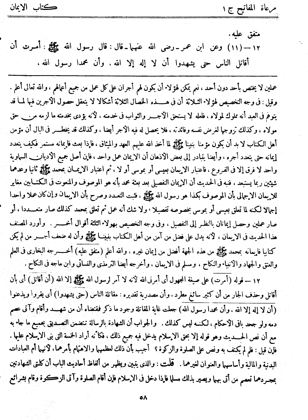 12- (11) وعن ابن عمر – رضي الله عنهما – قال: قال رسول الله - صلى الله عليه وسلم -: ((أمرت أن أقاتل الناس حتى يشهدوا أن لا إله إلا الله، وأن محمداً رسول الله،