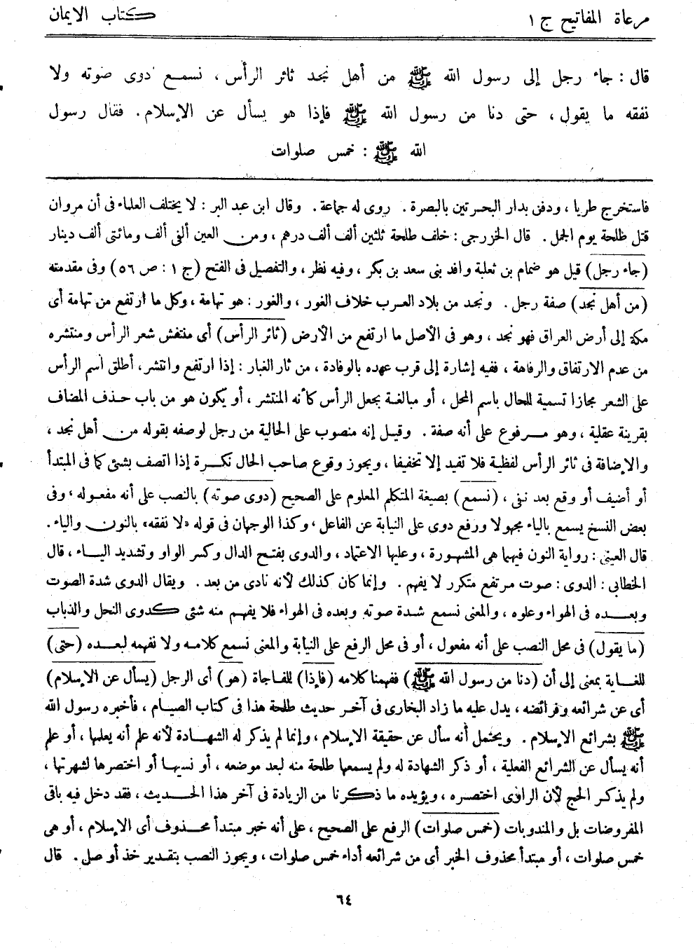 فاستخرج طرياً، ودفن بدار البحرتين بالبصرة، روى له جماعة، وقال ابن عبد البر: لا يختلف العلماء في أن مروان قتل طلحة يوم الجمل، قال الخزرجي: خلف طلحة ثلاثين ألف ألف درهم، ومن العين ألفي ألف ومائتي ألف دينار. (جاء رجل) قيل: هو ضمام بن ثعلبة وافد بني سعد بني بكر، وفيه نظر، والتفصيل في الفتح (ج1: ص56) وفي مقدمته، (من أهل نجد) صفة رجل، ونجد من بلاد العرب خلاف الغور، والغور: هو تهامة، وكل ما ارتفع من تهامة أي مكة إلى أرض العراق فهو نجد، وهو في الأصل ما ارتفع من الأرض (ثائر الرأس) أي منتفش شعر الرأس ومنتشره من عدم الارتفاق والرفاهة، ففيه إشارة إلى قرب عهده بالوفادة، من ثار الغبار: إذا ارتفع وانتشر، أطلق اسم الرأس على الشعر مجازاً تسمية للحال باسم المحل، أو مبالغة بجعل الرأس كأنه المنتشر، أو يكون هو من باب حذف المضاف بقرينة عقلية، وهو مرفوع على أنه صفة، وقيل: إنه منصوب على الحالية من رجل لوصفه بقوله من أهل نجد، والإضافة في ثائر الرأس لفظية فلا تفيد إلا تخفيفاً، ويجوز وقوع صاحب الحال نكرة إذا اتصف بشيء كما في المبتدأ أو أضيف أو وقع بعد نفي (نسمع) بصيغة المتكلم المعلوم على الصحيح (دوي صوته) بالنصب على أنه مفعوله، وفي بعض النسخ يسمع بالياء مجهولاً ورفع دوي على النيابة عن الفاعل، وكذا الوجهان في قوله ((لا نفقه)) بالنون والياء، قال العيني: رواية النون فيهما هي المشهورة، وعليها الاعتماد، والدوي: بفتح الدال وكسر الواو وتشديد الياء، قال الخطابي: الدوي: صوت مرتفع متكرر لا يفهم، وإنما كان كذلك لأنه نادى من بُعد، ويقال: الدوي شدة الصوت وبُعده في الهواء وعلوه، والمعنى نسمع شدة صوته وبُعده في الهواء فلا يفهم منه شيء كدوي النحل والذباب (ما يقول) في محل النصب على أنه مفعول، أو في الرفع على النيابة والمعنى نسمع كلامه ولا نفهمه لبُعده (حتى) للغاية بمعنى إلى أن (دنا من رسول الله - صلى الله عليه وسلم -) ففهمنا كلامه (فإذا) للمفاجأة (هو) أي الرجل (يسأل عن الإسلام) أي عن شرائعه وفرائضه، يدل عليه ما زاد البخاري في آخر حديث طلحة هذا في كتاب الصيام، فأخبره رسول الله - صلى الله عليه وسلم - بشرائع الإسلام، ويحتمل أنه سأل عن حقيقة الإسلام، وإنما لم يذكر له الشهادة لأنه علم أنه يعلمها، أو علم أنه يسأل عن الشرائع الفعلية، أو ذكر الشهادة له ولم يسمعها طلحة منه لبعد موضعه، أو نسيها أو اختصرها لشهرتها، ولم يذكر الحج؛ لأن الراوي اختصره، ويؤيده ما ذكرنا من الزيادة في آخر هذا الحديث، فقد دخل فيه باقي المفروضات بل والمندوبات (خمس صلوات) الرفع على الصحيح، على أنه خبر مبتدأ محذوف أي الإسلام، أو هي خمس صلوات، أو مبتدأ محذوف الخبر من شرائعه أداء خمس صلوات، ويجوز النصب بتقدير خذ أو صل، قال