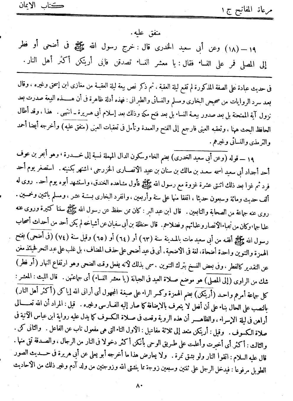 19- (18) وعن أبي سعيد الخدري قال: خرج رسول الله - صلى الله عليه وسلم - في أضحى أو فطر إلى المصلى فمر على النساء فقال: يا معشر النساء تصدقن فإني رأيتكن أكثر أهل النار،