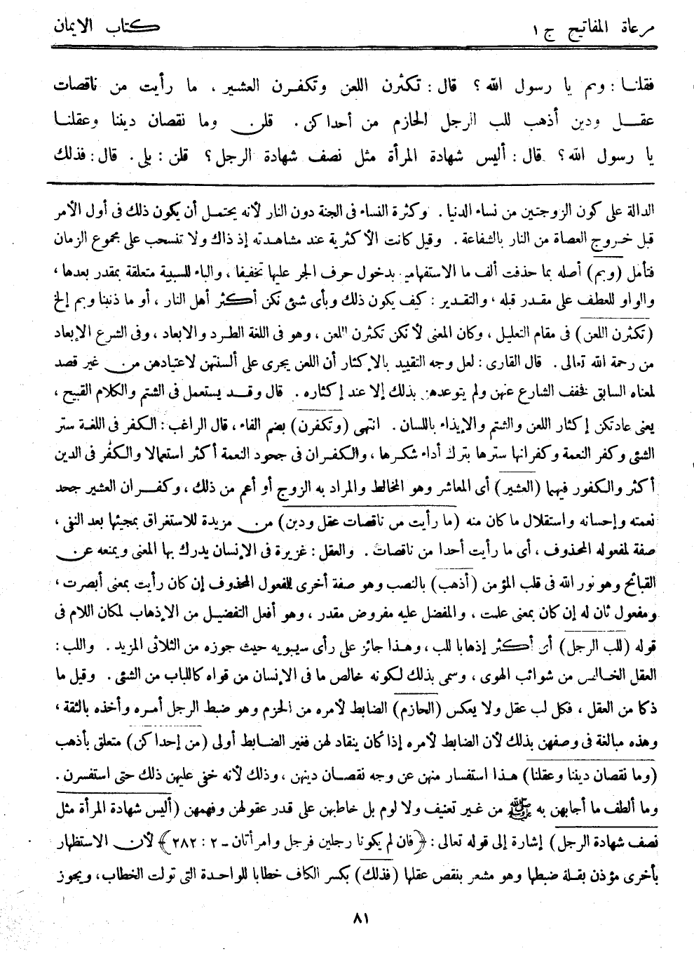 فقلنا: وبم يا رسول الله؟ قال: تكثرن اللعن، وتكفرن العشير، ما رأيت من ناقصات عقل ودين أذهب للب الرجل الحازم من إحداكن، قلن: وما نقصان ديننا وعقلنا يا رسول الله؟ قال: أليس شهادة المرأة مثل نصف شهادة الرجل؟ قلن: بلى، قال: فذلك