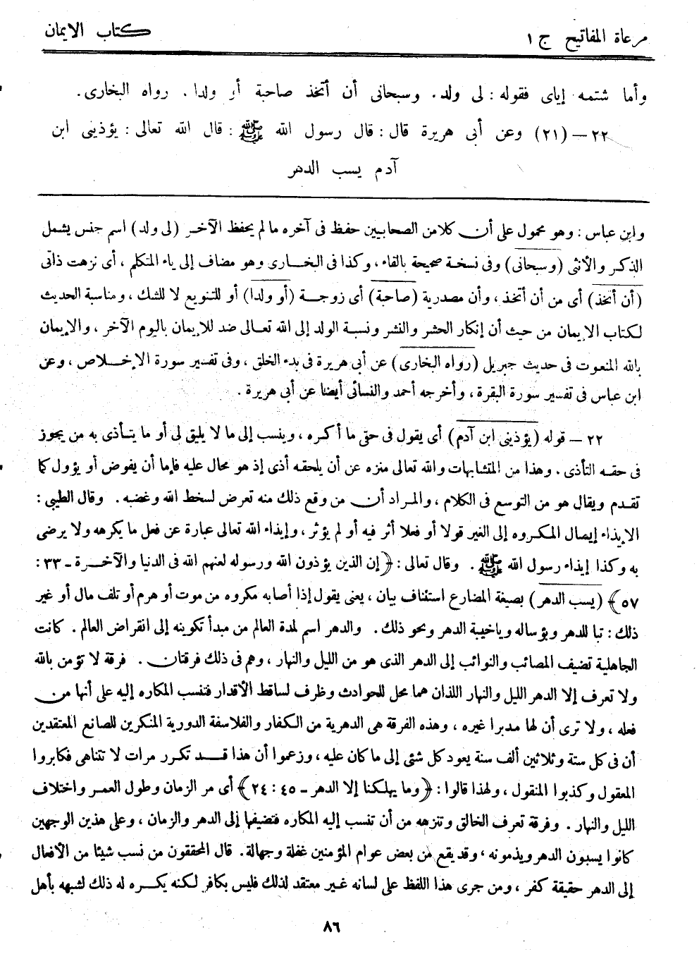 22- قوله: (يؤذيني ابن آدم) أي يقول في حقي ما أكره، وينسب إلي ما لا يليق لي أو ما يتأذى به من يجوز في حقه التأذي، وهذا من المتشابهات، والله تعالى منَزه عن أن يلحقه أذى، إذ هو محال عليه، فإما أن يفوض أو يؤول كما تقدم، ويقال: هو من التوسع في الكلام، والمراد أن من وقع ذلك منه تعرض لسخط الله وغضبه. وقال الطيبي: الإيذاء إيصال المكروه إلى الغير قولاً أو فعلاً أثر فيه أو لم يؤثر، وإيذاء الله تعالى عبارة عن فعل ما يكرهه ولا يرضى به وكذا إيذاء رسول الله - صلى الله عليه وسلم - , وقال تعالى: {إن الذين يؤذون الله ورسوله لعنهم الله في الدنيا والآخرة} [33: 57] ، (يسب الدهر) بصيغة المضارع استئناف بيان، يعني يقول إذا أصابه مكروه من موت أو هرم أو تلف مال أو غير ذلك: تباً للدهر وبؤساً له ويا خيبة الدهر ونحو ذلك، والدهر اسم لمدة العالم من مبدأ تكوينه إلى انقراض العالم، كانت الجاهلية تضيف المصائب والنوائب للدهر الذي هو من الليل والنهار، وهم في ذلك فرقتان، فرقة لا تؤمن بالله ولا تعرف إلا الدهر الليل والنهار اللذان هما محل للحوادث وظرف لساقط الأقدار، فتنسب المكاره إليه على أنها من فعله، ولا ترى أن لها مدبراً غيره، وهذه الفرقة هي الدهرية من الكفار والفلاسفة الدورية المنكرين للصانع، المعتقدين أن في كل ستة وثلاثين ألف سنة يعود كل شيء إلى ما كان عليه، وزعموا أن هذا قد تكرر مرات لا تتناهى، فكابروا المعقول وكذبوا المنقول، ولهذا قالوا: {وما يهلكنا إلا الدهر} [45: 24] أي مر الزمان وطول العمر واختلاف الليل والنهار، وفرقة تعرف الخالق وتنَزهه من أن تنسب إليه المكاره فتضيفها إلى الدهر والزمان، وعلى هذين الوجهين كانوا يسبون الدهر ويذمونه، وقد يقع من بعض عوام المؤمنين غفلة وجهالة، قال المحققون من نسب شيئاً من الأفعال إلى الدهر حقيقة كفر، ومن جرى هذا اللفظ على لسانه غير معتقد لذلك فليس بكافر لكنه يكره له ذلك لشبهه بأهل