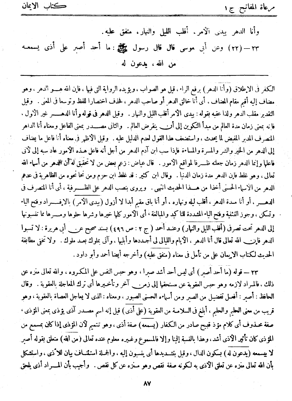 الكفر في الإطلاق (وأنا الدهر) برفع الراء، قيل: هو الصواب، ويؤيده الرواية التي فيها: ((فإن الله هو الدهر)) ، وهو مضاف إليه أقيم مقام المضاف، أي أنا خالق الدهر أو صاحب الدهر، فحذف اختصاراً للفظ وتوسعاً في المعنى، وقيل: التقدير مقلب الدهر ولذا عقبه بقوله: بيدي الأمر أقلب الليل والنهار، وقيل: الدهر في قوله (وأنا الدهر) غير الأول، فإنه بمعنى زمان مدة العالم من مبدأ التكوين إلى أن ينقرض العالم، والثاني مصدر بمعنى الفاعل ومعناه أنا الداهر المتصرف المدبر المفيض لما يحدث، واستضعف هذا القول لعدم الدليل عليه، وقيل: الأظهر في معناه أنا فاعل ما يضاف إلى الدهر من الخير والشر والمسرة والمساءة، فإذا سب ابن آدم الدهر من أجل أنه فاعل هذه الأمور عاد سبه إليّ؛ لأني فاعلها وإنما الدهر زمان جعلته ظرفاً لمواقع الأمور. قال عياض: زعم بعض من لا تحقيق له أن الدهر من أسماء الله تعالى، وهو غلط، فإن الدهر مدة زمان الدنيا، وقال ابن كثير: قد غلط ابن حزم ومن نحا نحوه من الظاهرية في عدهم الدهر من الأسماء الحسنى أخذاً من هذا الحديث – انتهى. ويروى بنصب الدهر على الظرفية، أي أنا المتصرف في الدهر، أو أنا مدة الدهر، أقلب ليله ونهاره، أو أنا باقٍ مقيم أبداً لا أزول (بيدي الأمر) بالإفراد وفتح الياء وتسكن، وجوز التثنية وفتح الياء المشددة للتأكيد والمبالغة، أي الأمور كلها خيرها وشرها حلوها ومرها مما تنسبونها إلى الدهر تحت تصرفي (أقلب الليل والنهار) ، وعند أحمد (ج2: ص496) بسند صحيح عن أبي هريرة: ((لا تسبوا الدهر فإن الله تعالى قال: أنا الدهر، الأيام والليالي لي أجددها وأبليها، وآتي بملوك بعد ملوك)) ، ولا تخفى مطابقة الحديث لكتاب الإيمان على من تأمل في معناه. (متفق عليه) وأخرجه أيضاً أحمد وأبوداود.