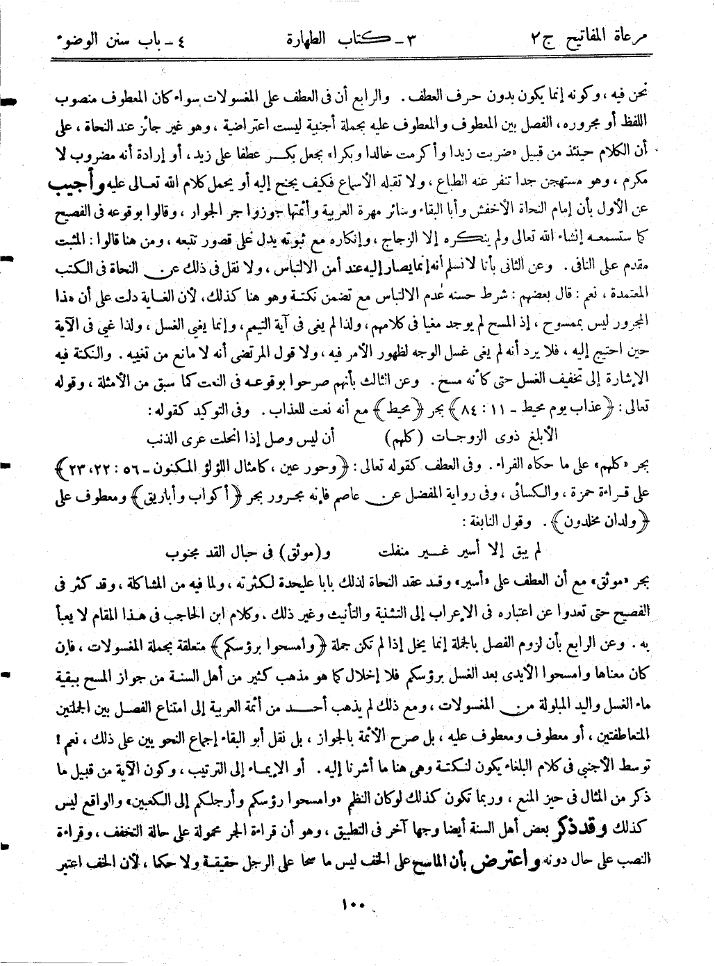 يجر "موثق" مع أن العطف على "أسير" وقد عقد النحاة لذلك بابا على حدة لكثرته، ولما فيه من المشاكلة، وقد كثر في الفصيح حتى تعدوا عن اعتباره في الإعراب إلى التثنية والتأنيث وغير ذلك، وكلام ابن الحاجب في هذا المقام لايعبأ به. وعن الرابع بأن لزوم الفصل بالجملة إنما يخل إذا لم تكن جملة {وامسحوا برؤسكم} متعلقة بجملة المغسولات، فإن كان معناها وامسحوا الأيدي بعد الغسل برؤسكم فلا إخلال كما هو مذهب كثير من أهل السنة، من جواز المسح ببقية ماء الغسل واليد المبلولة من المغسولات، ومع ذلك لم يذهب أحدٌ من أئمة العربية إلى امتناع الفصل بين الجملتين المتعاطفتين، أو معطوف ومعطوف عليه، بل صرح الأئمة بالجواز، بل نقل أبوالبقاء إجماع النحويين على ذلك، نعم! توسط الأجنبي في كلام البلغاء يكون لنكتة وهي هنا ما أشرنا إليه. أو الإيماء إلى الترتيب، وكون الآية من قبيل ما ذكر من المثال في حين المنع، وربما تكون كذلك لو كان النظم "وامسحوا رؤسكم وأرجلكم إلى الكعبين" والواقع ليس كذلك وقد ذكر بعض أهل السنة أيضاً وجهاً آخر في التطبيق، وهو أن قراءة الجر محمولة على حالة التخفف، وقراءة النصب على حال دونه واعترض بأن الماسح على الخف ليس ماسحاً على الرجل حقيقةً ولا حكماً، لأن الخف اعتبر