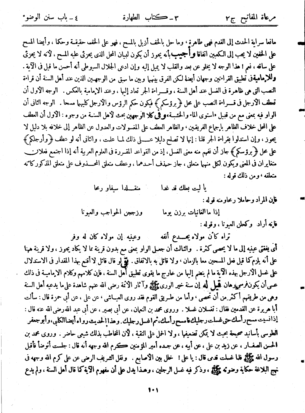 أى يفقئ عينيه إلى ما لا يحصى كثرة. والثالث: أن جعل الواو بمعنى مع بدون قرينة مما لا يكاد يجوز، ولا قرينة ههنا على أنه يلزم كما قيل فعل المسحين معاً بالزمان، ولا قائل به بالاتفاق. بقى لو قال قائل: لا أقنع بهذا المقدار في الاستدلال على غسل الأرجل بهذه الآية مالم ينضم إليها من خارج ما يقوى تطبيق أهل السنة، فإن كلامهم وكلام الإمامية في ذلك عسى أن يكون فرسي رهان. قيل له: إن سنة خير الورى - صلى الله عليه وسلم - وآثار الأئمة - رضي الله عنهم - شاهدة على ما يدعيه أهل السنة، وهي من طريقهم أكثر من أن تحصى، وأما من طريق القوم فقد روى العياشي، عن علي، عن أبي حمزة قال: سألت أباهريرة عن القدمين فقال: تغسلان غسلاً. وروى محمد بن النعمان، عن أبي بصير، عن أبي عبد الله - رضي الله عنه - قال: إذا نسيت مسح رأسك حتى غسلت رجليك فامسح رأسك، ثم اغسل رجليك. وهذا الحديث رواه أيضاً الكلبي، وأبوجعفر الطوسي بأسانيد صحيحة بحيث لا يمكن تضعيفها، ولا الحمل على التقية، لأن المخاطب بذلك شيعي حاضر. وروى محمد بن الحسن الصفار، عن زيد بن علي، عن أبيه، عن جده أمير المؤمنين - كرم الله وجهه - أنه قال: جلست أتوضأ فأقبل رسول الله - صلى الله عليه وسلم - فلما غسلت قدمي قال: يا علي! خلل بين الأصابع. ونقل الشريف الرضي عن علي - كرم الله وجهه - في نهج البلاغة حكاية وضوئه - صلى الله عليه وسلم -، وذكر فيه غسل الرجلين، وهذا يدل على أن مفهوم الآية كما قال أهل السنة، ولم يدع