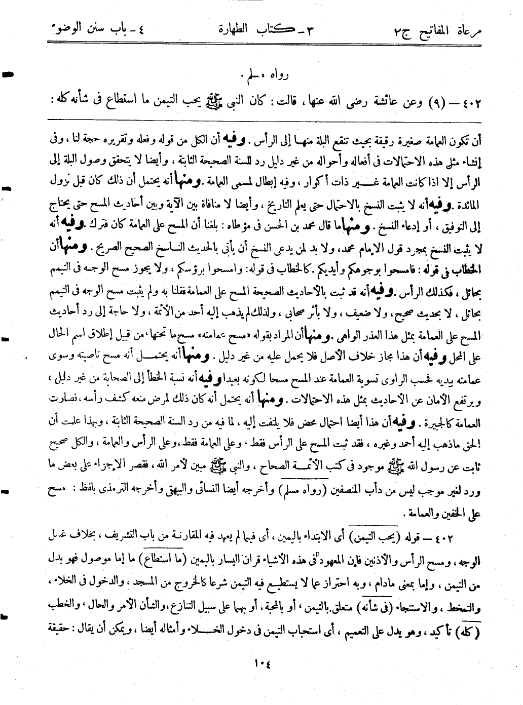 402- (9) وعن عائشة رضي الله عنها، قالت: ((كان النبي - صلى الله عليه وسلم - يحب التيمن ما استطاع في شأنه كله