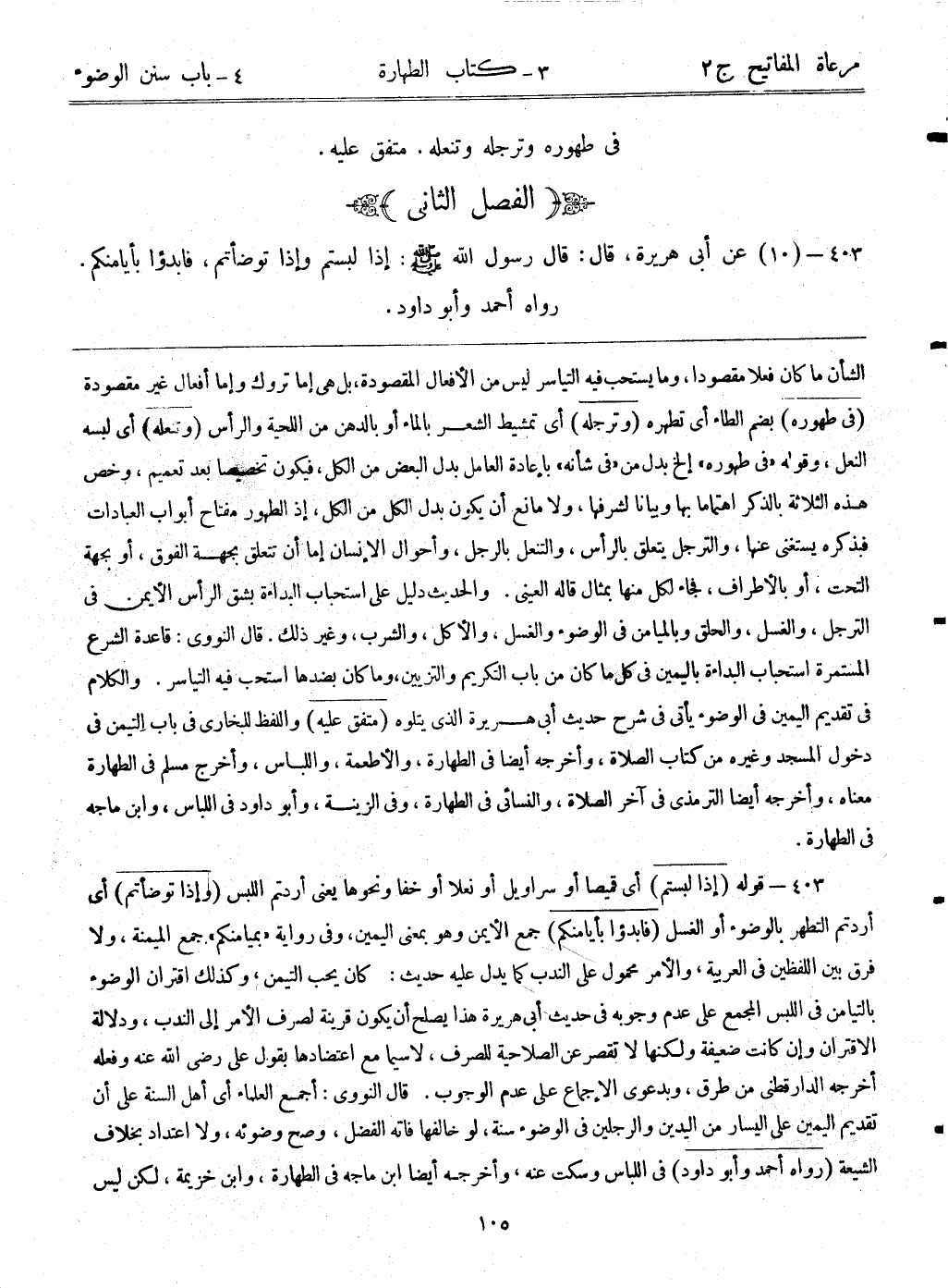 403- قوله: (إذا لبستم) أي قميصاً أو سراويل أو نعلاً أو خفاً ونحوها يعني أردتم اللبس (وإذا توضأتم) أي أردتم التطهر بالوضوء أو الغسل (فابدؤوا بأيامنكم) جمع الأيمن وهو بمعنى اليمين، وفي رواية (بميامنكم) جمع الميمنة، ولا فرق بين اللفظين في العربية، والأمر محمول على الندب كما يدل عليه حديث: "كان يحب التيمن"، وكذلك اقتران الوضوء بالتيامن في اللبس المجمع على عدم وجوبه في حديث أبي هريرة هذا يصلح أن يكون قرينة لصرف الأمر إلى الندب، ودلالة الاقتران وإن كانت ضعيفة ولكنها لا تقصر عن الصلاحية للصرف، لاسيما مع اعتضادها بقول علي - رضي الله عنه - وفعله. أخرجه الدارقطني من طرق، وبدعوى الإجماع على عدم الوجوب. قال النووي: أجمع العلماء - أي أهل السنة - على أن تقديم اليمين على اليسار من اليدين والرجلين في الوضوء سنة، لو خالفها فاته الفضل، وصح وضوئه، ولا اعتداد بخلاف الشيعة (رواه أحمد وأبوداود) في اللباس وسكت عنه، وأخرجه أيضاً ابن ماجه في الطهارة، وابن خزيمة، لكن ليس