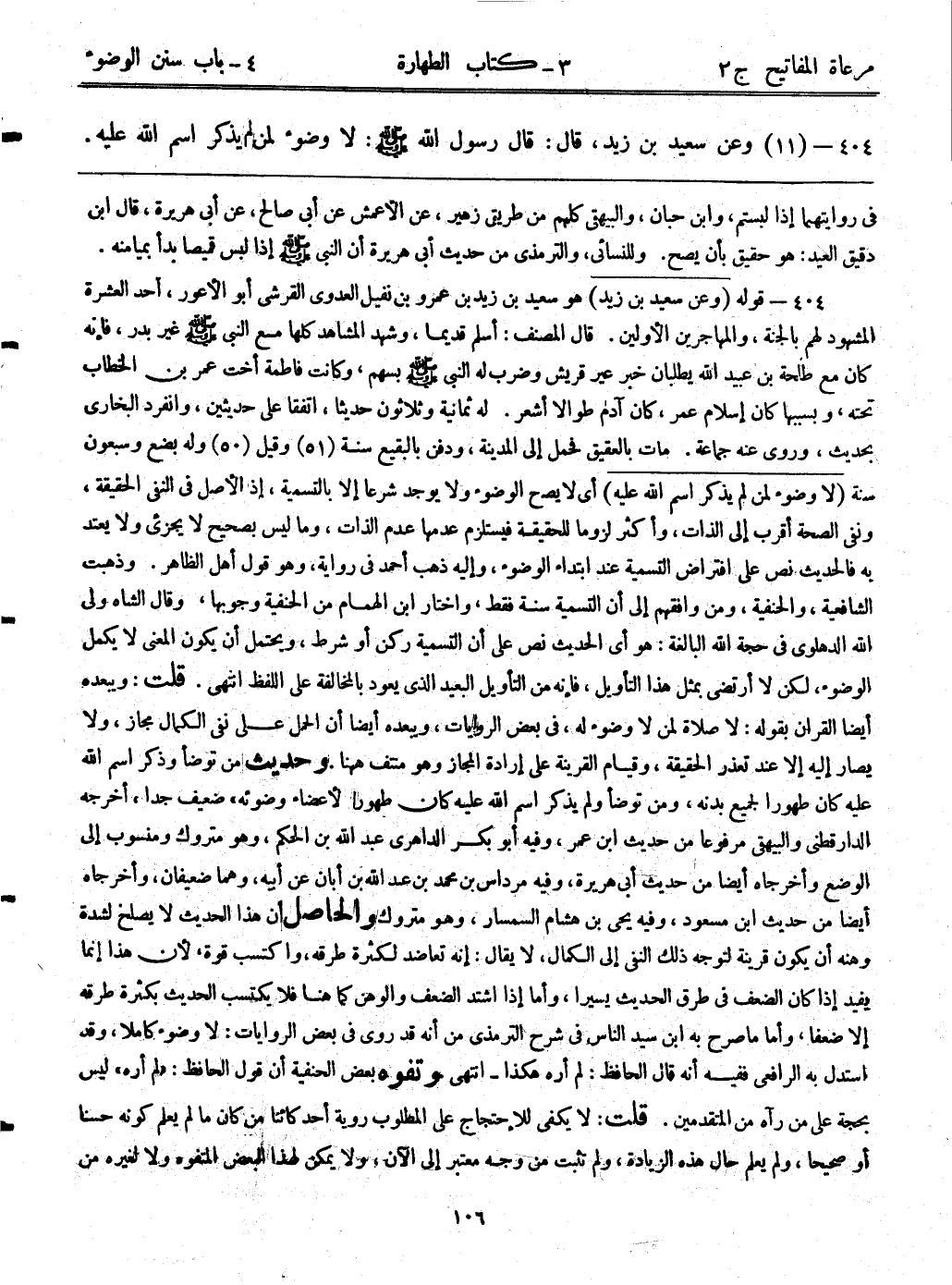 404- قوله: (وعن سعيد بن زيد) هو سعيد بن زيد بن عمرو بن نفيل العدوي القرشي أبوالأعور، أحد العشرة المشهود لهم بالجنة، والمهاجرين الأولين. قال المصنف: أسلم قديماً، وشهد المشاهد كلها مع النبي - صلى الله عليه وسلم - غير بدر، فإنه كان مع طلحة بن عبيد الله يطلبان خبر عير قريش وضرب له النبي - صلى الله عليه وسلم - بسهم، وكانت فاطمة أخت عمر بن الخطاب تحته، وبسببها كان إسلام عمر، كان آدم طوالاً أشعر. له ثمانية وثلاثون حديثاً، اتفقا على حديثين، وانفرد البخاري بحديث، وروى عنه جماعة. مات بالعقيق فحمل إلى المدينة، ودفن بالبقيع سنة (51) وقيل (50) وله بضع وسبعون سنة. (لا وضوء لمن لم يذكر اسم الله عليه) أي لا يصح الوضوء ولا يوجد شرعاً إلا بالتسمية، إذ الأصل في النفي الحقيقة، ونفى الصحة أقرب إلى الذات، وأكثر لزوماً للحقيقة فيستلزم عدمها عدم الذات، وما ليس بصحيح لا يجزئ ولا يعتد به فالحديث نص على افتراض التسمية عند ابتداء الوضوء، وإليه ذهب أحمد في رواية، وهو قول أهل الظاهر. وذهبت الشافعية، والحنفية، ومن وافقهم إلى أن التسمية سنة فقط، واختار ابن الهمام من الحنفية وجوبها، وقال الشاه ولي الله الدهلوي في حجة الله البالغة: هو أي الحديث نص على أن التسمية ركن أو شرط، ويحتمل أن يكون المعنى لا يكمل الوضوء، لكن لا أرتضى بمثل هذا التأويل، فإنه من التأويل البعيد الذي يعود بالمخالفة على اللفظ انتهى. قلت: ويبعده أيضاً القرآن بقوله: لا صلاة لمن لا وضوء له، وفي بعض الروايات، ويبعده أيضاً أن الحمل على نفى الكمال مجاز، ولا يصار إليه إلا عند تعذر الحقيقة، وقيام القرينة على إرادة المجاز وهو منتف ههنا. وحديث "من توضأ وذكر اسم الله عليه كان طهورا لجميع بدنه، ومن توضأ ولم يذكر اسم الله عليه كان طهوراً لأعضاء وضوئه" ضعيف جداً، أخرجه الدارقطني والبيهقي مرفوعاً من حديث ابن عمر، وفيه أبوبكر الداهري عبد الله بن الحكم، وهو متروك ومنسوب إلى الوضع. وأخرجاه أيضاً من حديث أبي هريرة، وفيه مرداس بن محمد بن عبد الله بن أبان عن أبيه، وهما ضعيفان، وأخرجاه أيضاً من حديث ابن مسعود، وفيه يحيى بن هشام السمسار، وهو متروك والحاصل أن هذا الحديث لا يصلح لشدة وهنه أن يكون قرينة لتوجه ذلك النفي إلى الكمال، لا يقال: إنه تعاضد لكثرة طرقه، واكتسب قوة، لأن هذا إنما يفيد إذا كان الضعف في طرق الحديث يسيراً، وأما إذا اشتد الضعف والوهن كما هنا فلا يكتسب الحديث بكثرة طرقه إلا ضعفاً، وأما ما صرح به ابن سيد الناس في شرح الترمذي من أنه قد روى في بعض الروايات: "لا وضوء كاملاً" وقد استدل به الرافعي ففيه انه قال الحافظ: لم أره هكذا- انتهى. وتفوه بعض الحنفية أن قول الحافظ: "لم أره" ليس بحجة على من رآه من المتقدمين. قلت: لا يكفى للاحتجاج على المطلوب راوية أحد كائناً من كان ما لم يعلم كونه حسناً أو صحيحاً، ولم يعلم حال هذه الزيادة، ولم تثبت من وجه معتبر إلى الآن، ولا يمكن لهذا البعض المتفوه ولا لغيره من
