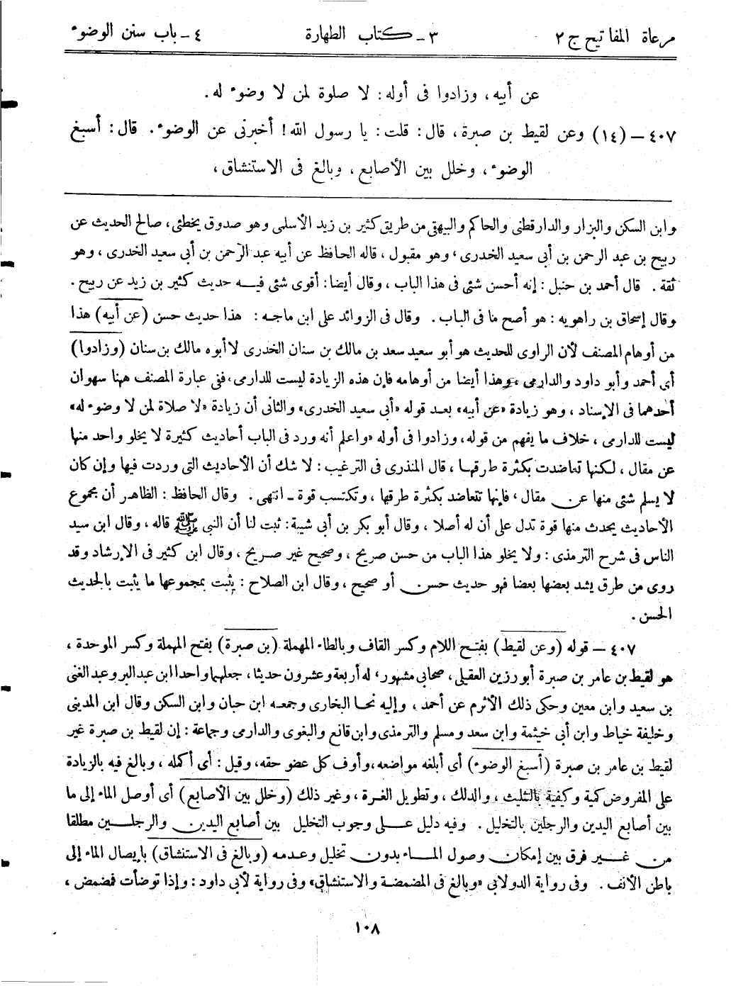407- قوله: (وعن لقيط) بفتح اللام وكسر القاف وبالطاء المهملة (بن صبرة) بفتح المهملة وكسر الموحدة، هو لقيط بن عامر بن صبرة أبورزين العقيلي، صحابي مشهور، له أربعة وعشرين حديثاً، جعلهما واحداً ابن عبد البر وعبد الغني بن سعيد وابن معين، وحكى ذلك الأثرم عن أحمد، وإليه نحا البخاري وجمعه ابن حبان وابن السكن، وقال ابن المديني وخليفة خياط وابن أبي خيثمة وابن سعد ومسلم والترمذي وابن قانع والبغوي والدارمي وجماعة: إن لقيط بن صبرة غير لقيط بن عامر بن صبرة. (أسبغ الوضوء) أي أبلغه مواضعه، وأوف كل عضو حقه، وقيل: أي أكمله، وبالغ فيه بالزيادة على المفروض كمية وكيفية بالتثليث، والدلك، وتطويل الغرة، وغير ذلك (وخلل بين الأصابع) أي أوصل الماء إلى ما بين أصابع اليدين والرجلين بالتخليل. وفيه دليل على وجوب التخليل بين أصابع اليدين والرجلين مطلقاً من غير فرق بين إمكان وصول الماء بدون تخليل وعدمه (وبالغ في الاستنشاق) بإيصال الماء إلى باطن الأنف. وفي رواية الدولابي (وبالغ في المضمضمة والاستنشاق) وفي رواية لأبي داود: وإذا توضأت فمضمض،